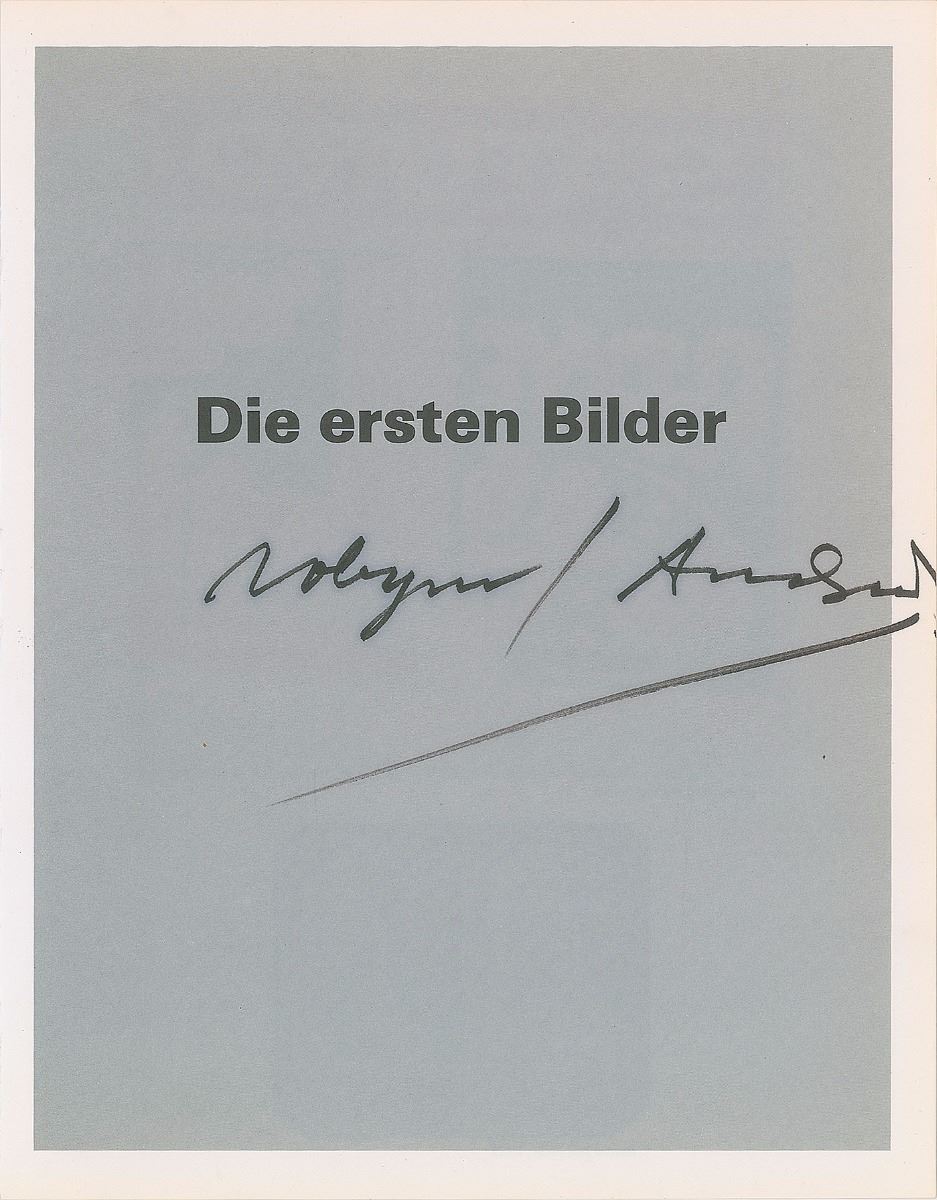 German program page removed from the art exhibition book 'Andy Warhol: Ein Buch zur Ausstellung im Kunsthaus Zurich,' 8 x 10.5, signed and inscribed in thick black felt tip, "Robyn / Andy W." The reverse features color images of Warhol's 'Saturday's Popeye' and 'Before and After.' In fine condition, with subtle haloing to the ink.