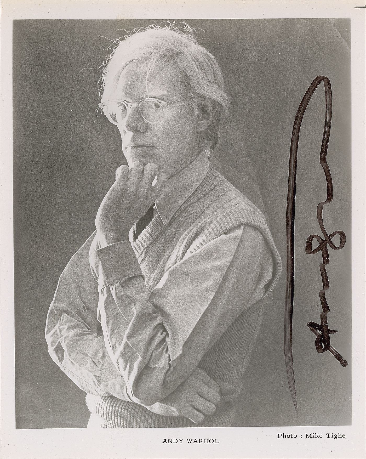 Desirable glossy 8 x 10 photo of Warhol in a handsome half-length pose, vertically signed in bold black felt tip. In fine condition, with two creases near the top, and a thin light vertical scratch passing through Warhol's image.