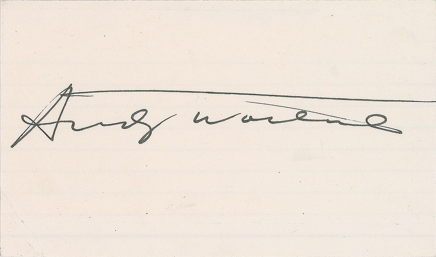 Felt tip signature, "Andy Warhol,” on an off-white 5 x 3 card. In fine condition, with a crease to the lower left corner and a subtle central bend.