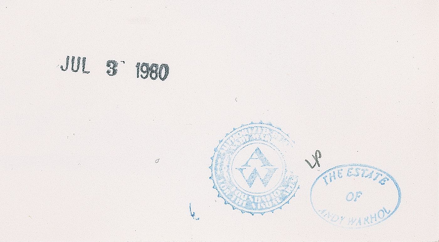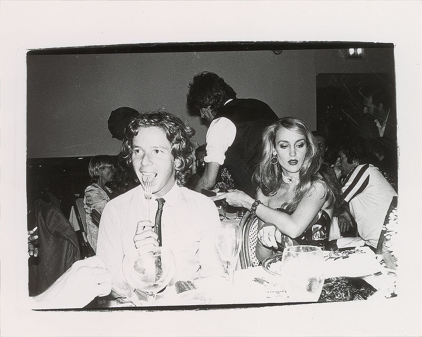 Exceptional 10 x 8 gelatin silver photograph by Andy Warhol of model Jerry Hall at her Studio 54 birthday party on July 3, 1980, showing Keith Richards socializing in the background. Executed in 1980. Lower right corner bears an Andy Warhol blindstamp. The reverse bears Estate of Andy Warhol and The Andy Warhol Foundation for the Visual Arts stamps, pencil notations along top edge, “FL08.00173,” and is stamp-dated, “Jul 3 1980.” In fine condition. This work is part of a database maintained by Christie's to substantiate provenance in the future and supply relevant information to the Andy Warhol Catalogue Raisonne. Deriving from the personal collection of the influential pop artist, this uncommon image captures the extravagant nightlife at the famed Studio 54.
