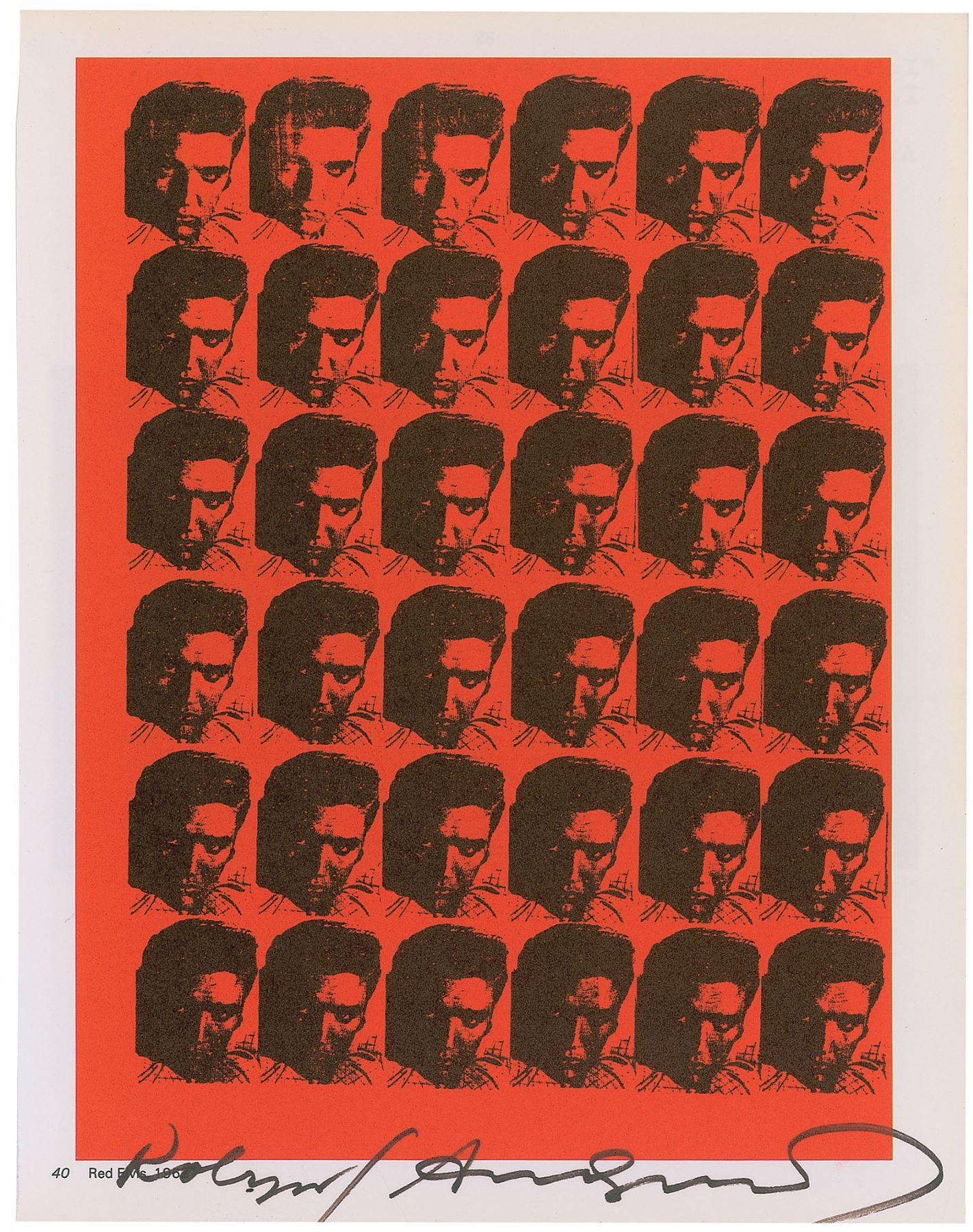 Iconic exhibition book page showing his artwork entitled 'Red Elvis, 1962,' 8 x 10.25, boldly signed and inscribed along the bottom in black felt tip, "Robyn / Andy Warhol." Removed from the 1978 German exhibition book entitled 'Andy Warhol: Ein Buch zur Ausstellung im Kunsthaus Zurich [A Book for the Exhibition at the Kunsthaus Zurich].' In fine condition. Consignor notes that this originates from the personal collection of artist Robyn Geddes, who worked for Andy Warhol at The Factory from 1978 to 1983.