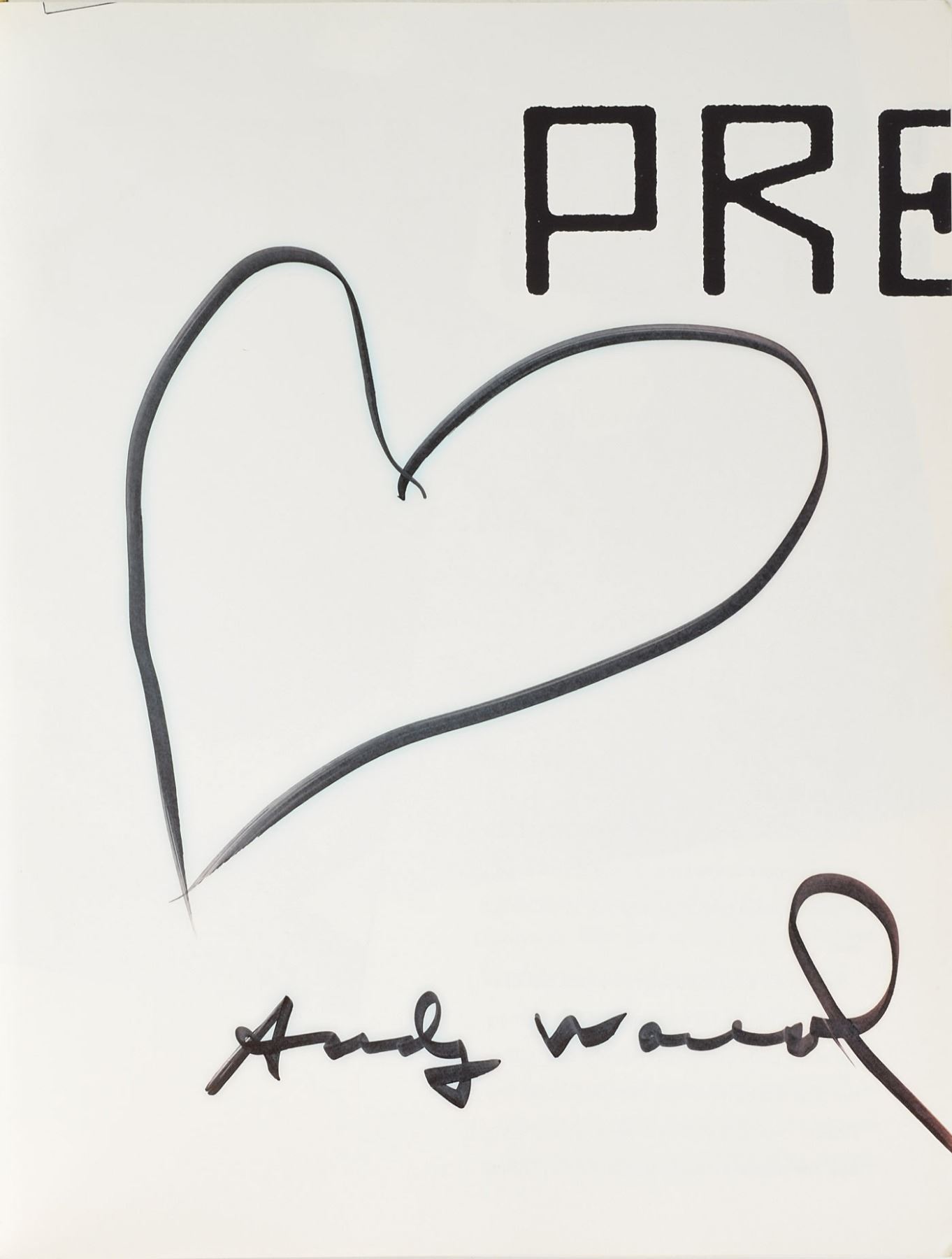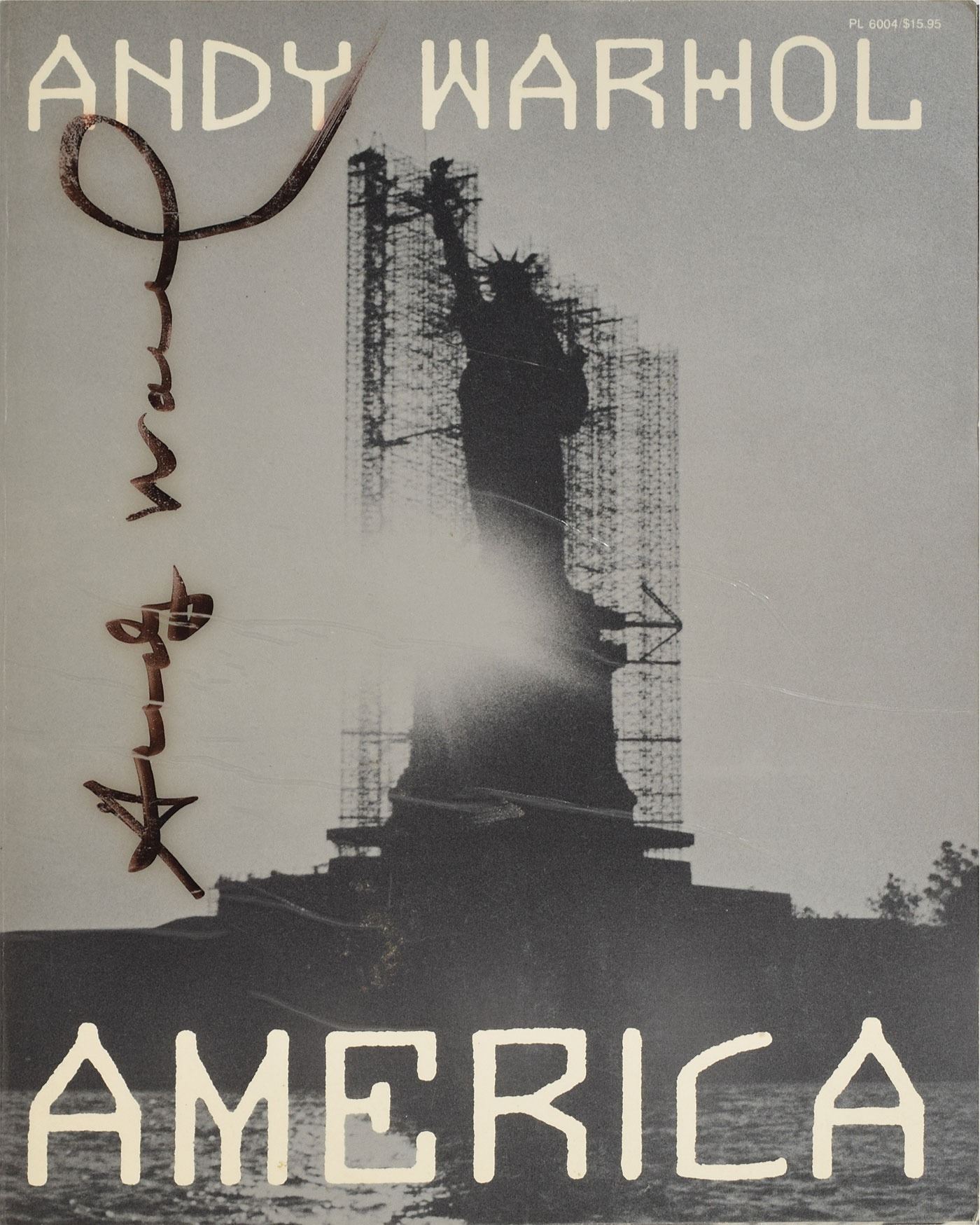 Signed book: America. First edition, first printing. NY: Harper & Row, 1985. Softcover, 8.5 x 11, 204 pages. Signed vertically on the front cover in black felt tip, "Andy Warhol," and signed again opposite the table of contents, "Andy Warhol," with the addition of a large sketch of a heart. The book consists primarily of photos of celebrities taken by Warhol, interspersed with his observations of America throughout. In very good condition, with rippling to the glossy cover laminate, and inner pages detached from the binding but all present.