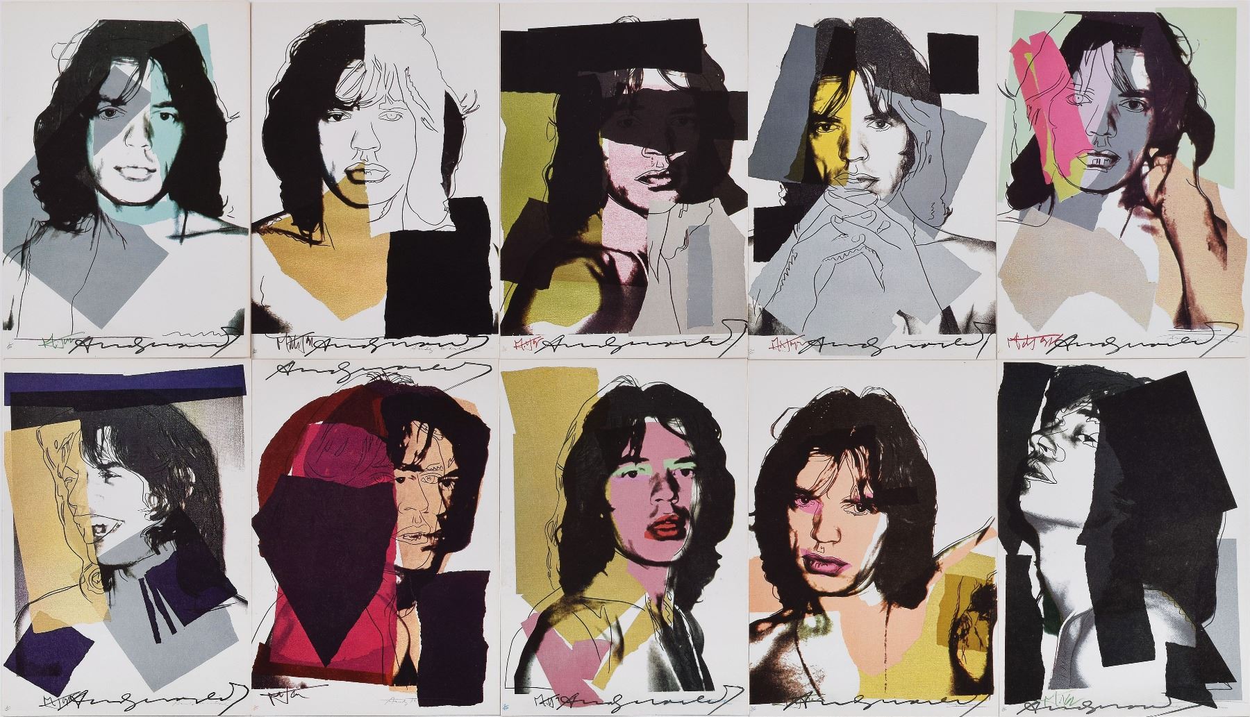 Highly sought-after complete ten postcard set of Andy Warhol's Mick Jagger screenprint series from 1975, each 4 x 6.25, each signed on the front in black felt tip by Warhol. Reverse of each card is numbered 1–10. Includes the original Multiples Inc./Castelli Graphics folder, advertising the forthcoming Seabird Editions prints of these portraits, which were released in a limited edition of 250. In overall fine condition. Having first met in 1963, Andy Warhol and Mick Jagger formed a working relationship during the height of their fame in the early 1970s. Consisting of ten photos he had taken of the Rolling Stones frontman, the series of screen prints vividly represented Warhol's stylistic shift from found imagery to a more 'handmade' approach, paying tribute to his friend and subject with neutral tones, bursts of color, and a marked focus on Jagger's sex appeal and rock star persona. A highly desirable and seldom-offered collection.