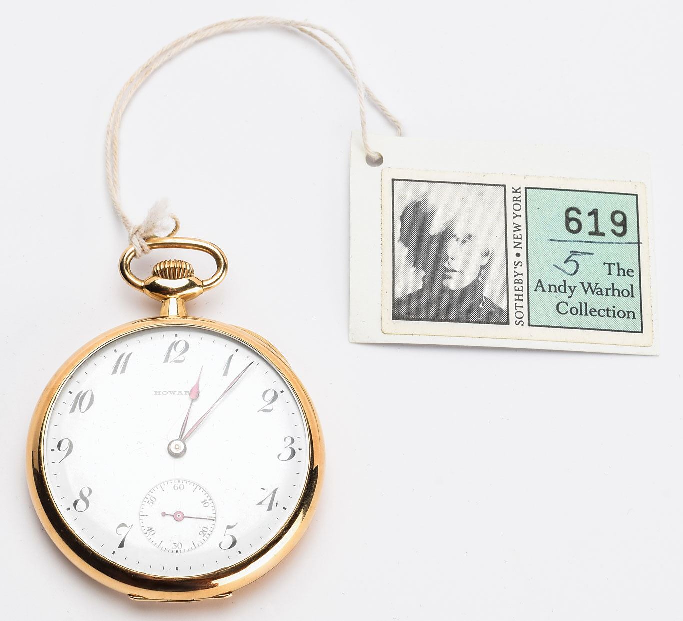 Andy Warhol's personally-owned 14K gold E. Howard pocket watch, measuring 1.75? in diameter, with an ornate engraved pattern to the caseback. The back opens to reveal the intricate 17-jewel movement, with serial no. 1202825, and the interior of the caseback is engraved "E. Howard Watch Co., Boston," stamped "14K," and marked with the serial no. 148873. The face is white with black Arabic numerals and black hands. In fine condition. Provenance: The Andy Warhol Collection, Sotheby's, April 1988. Accompanied by the original Sotheby's catalog, a copy of the lot tag, and a letter of provenance from University Archives.