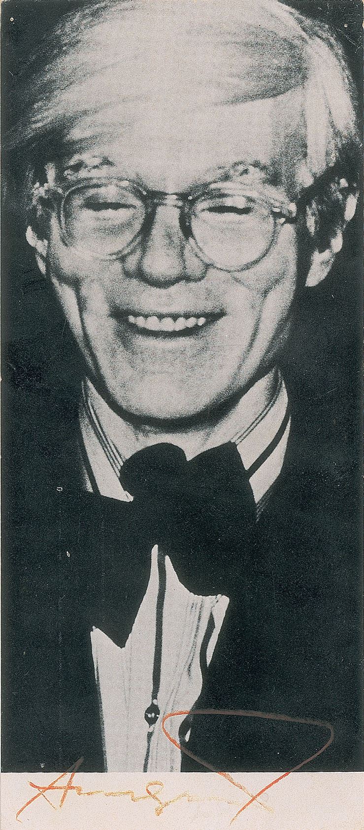 Uncommon 4 x 9 cardstock photo of Warhol with his eyes closed taken by Pat Hackett, signed in the lower border in orange pencil. In fine condition, with some fading, or adhesion trouble, to the signature. Accompanied by a postcard sent to subscribers of Interview Magazine bearing a stamped signature.