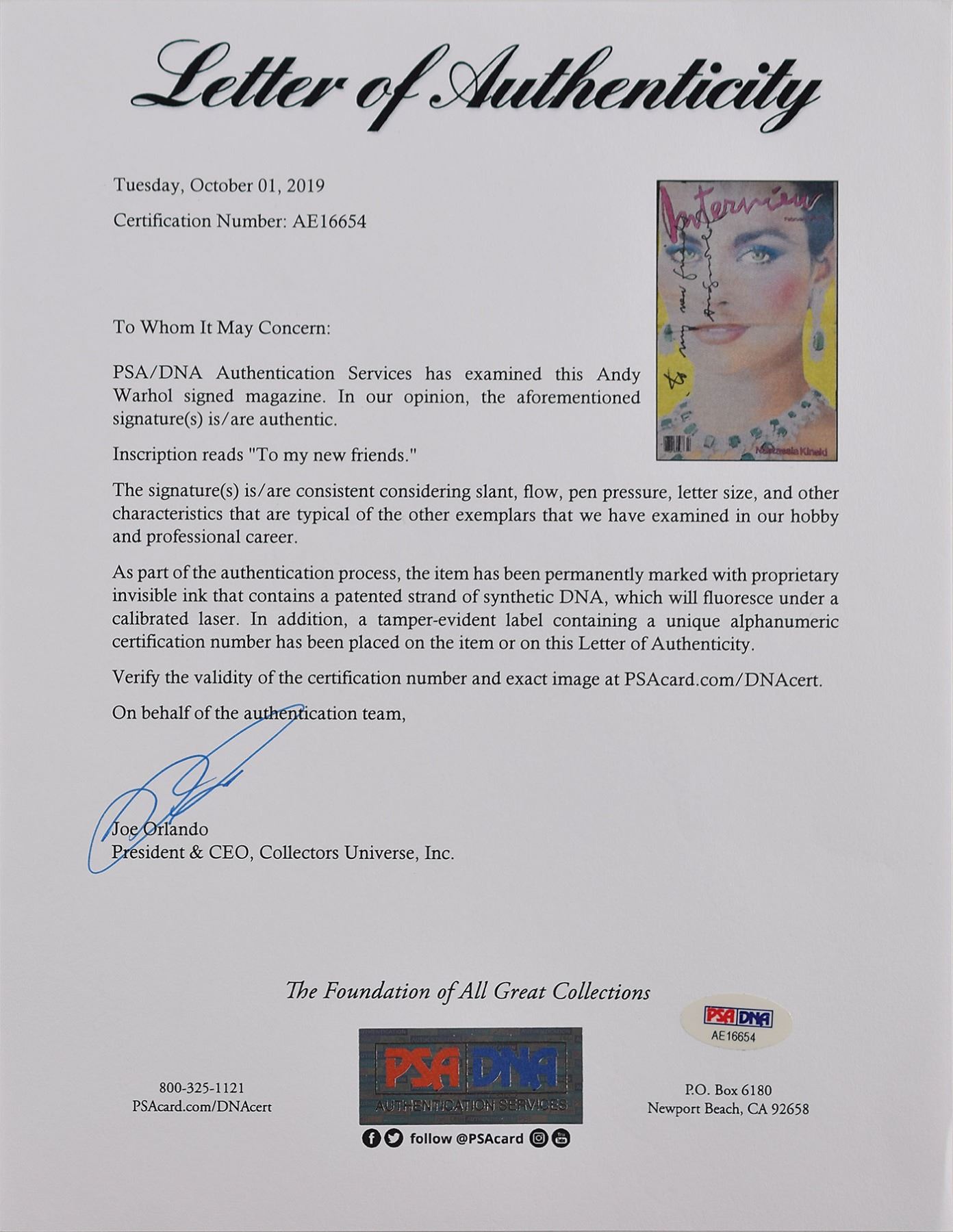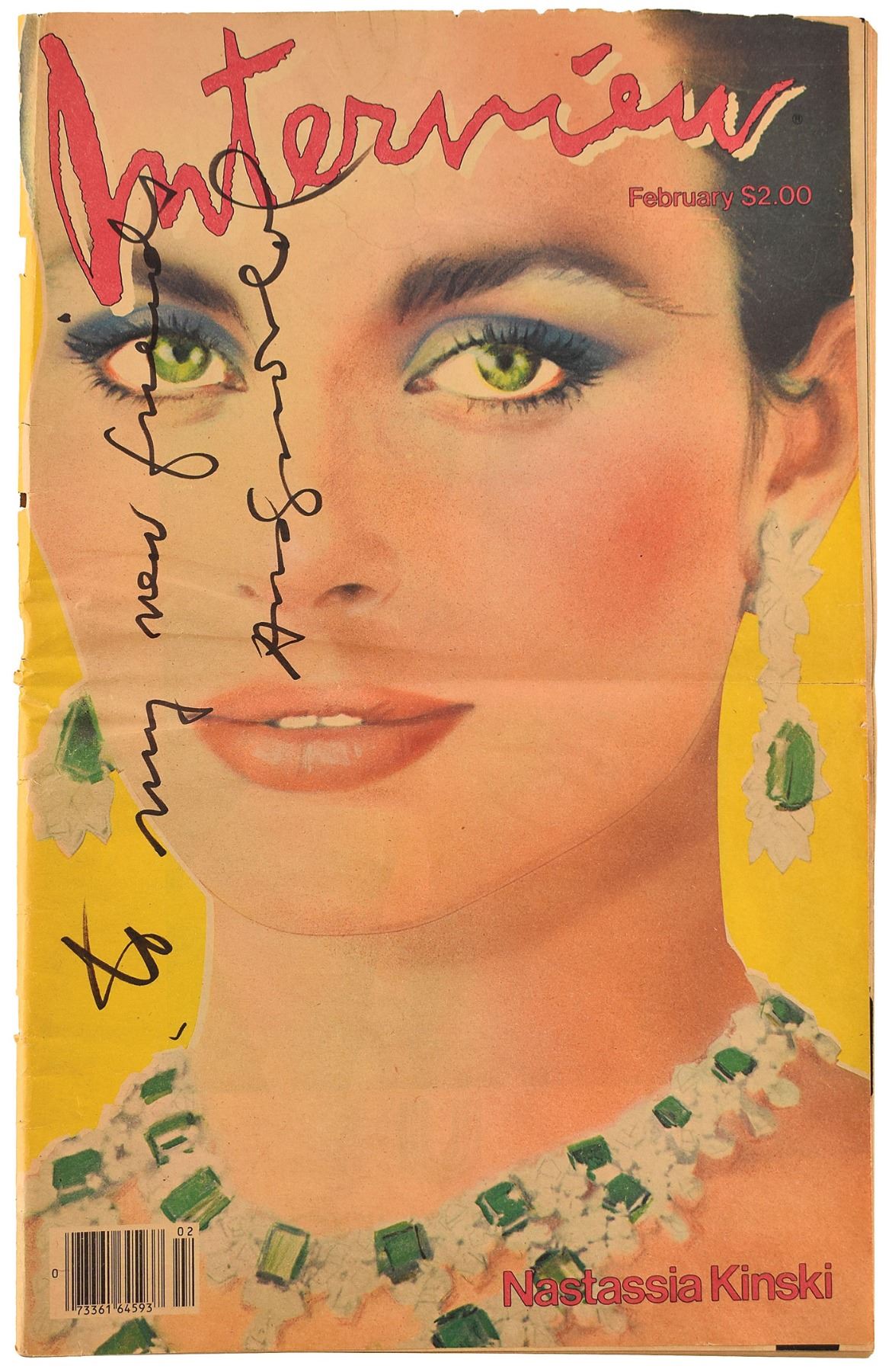 Interview magazine from February 1983, Vol. XIII, No. 2, 11 x 17, 86 pages, with Nastassja Kinski on the front cover, signed vertically on the front cover in black felt tip, "To my new friends, Andy Warhol." In very good condition, with edge wear and chipping, and a heavy horizontal crease across the center. Accompanied by a full letter of authenticity from PSA/DNA.
