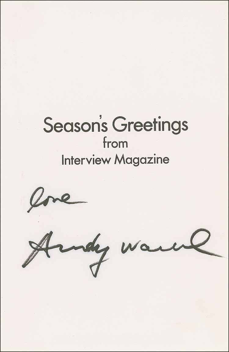 Christmas card sent on behalf of Warhol’s Interview magazine, 5.75 x 9, with an image of Warhol as Santa on the cover, signed inside in black felt tip beneath a pre-printed sentiment, “Love, Andy Warhol.” In fine condition. RRAuction COA.