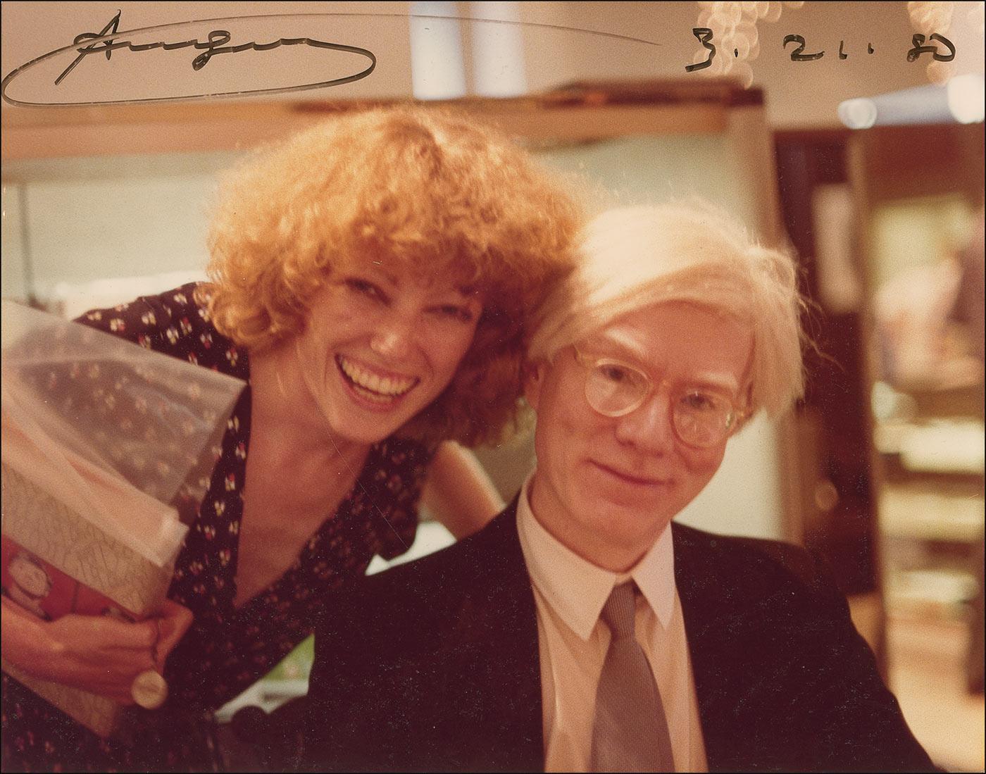Color satin-finish 14 x 11 candid photo of Warhol and a fan, signed in black felt tip. “Andy Warhol 3-21-80.” In fine condition, with surface marks and a slightly grainy appearance.