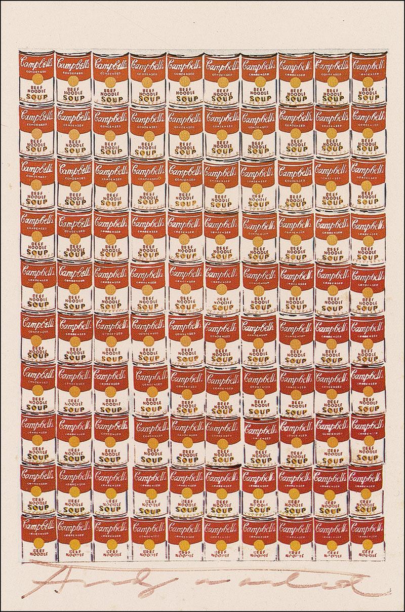 Color 4 x 6 postcard photo of Warhol’s 1962 work entitled ‘100 Cans,’ showing 100 stacked cans of Campbell’s Soup, signed in the lower border in brown felt tip. In fine condition. An eye-catching image of Warhol’s most famous subject. The original ‘100 Cans’ resides in the Albright-Knox Art Gallery in Buffalo, New York.