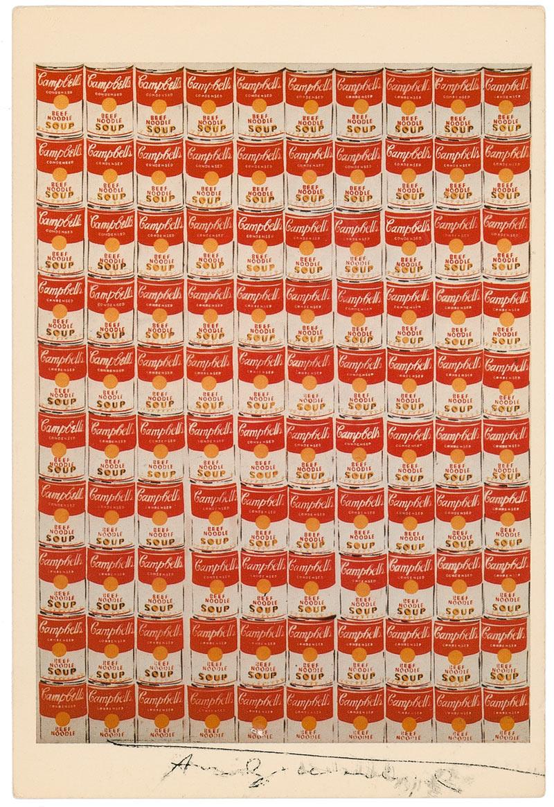Color 4 x 6 signed postcard photo of Warhol’s iconic painting, ‘100 Cans.’ In fine condition, with moderate smudging of Warhol’s name making the signature somewhat difficult to discern.