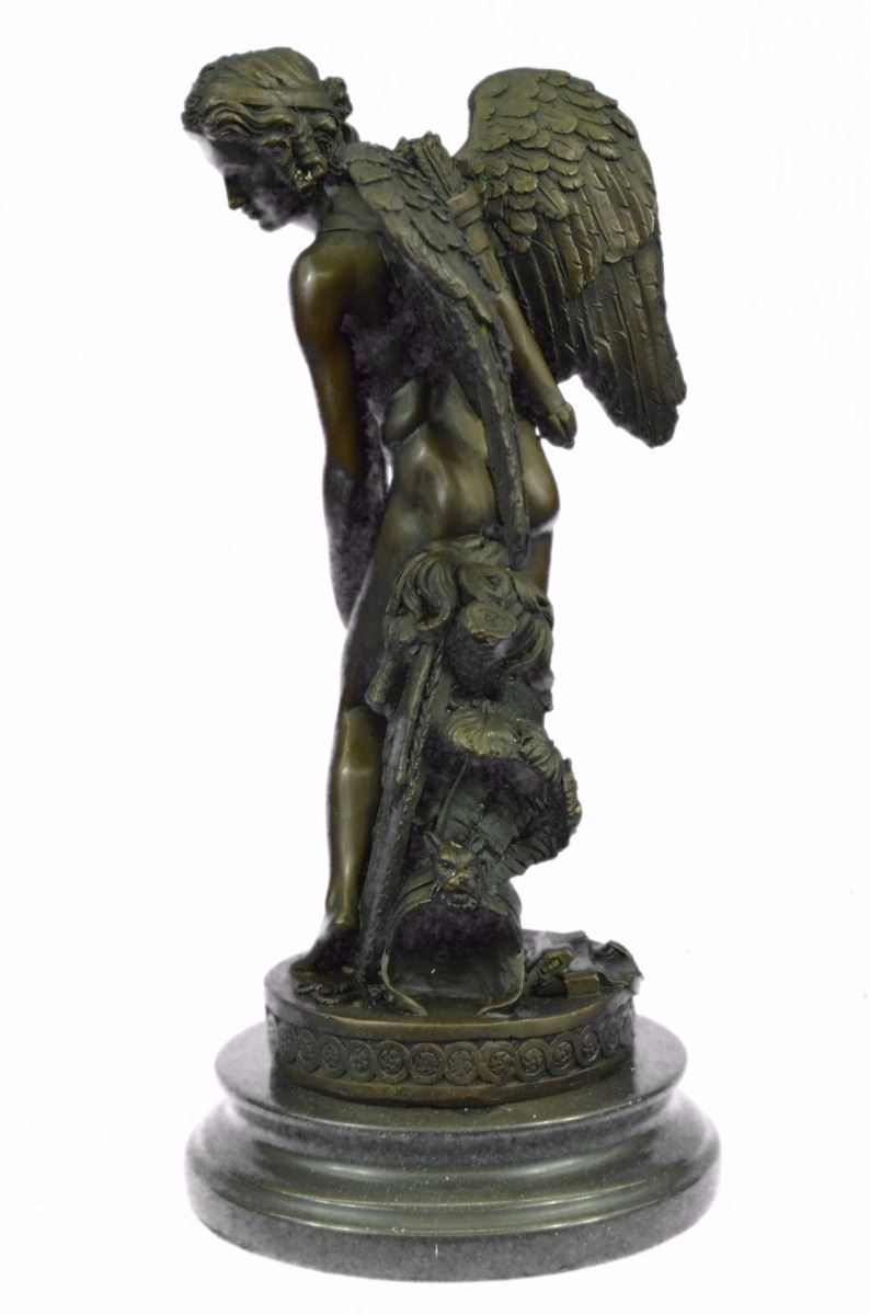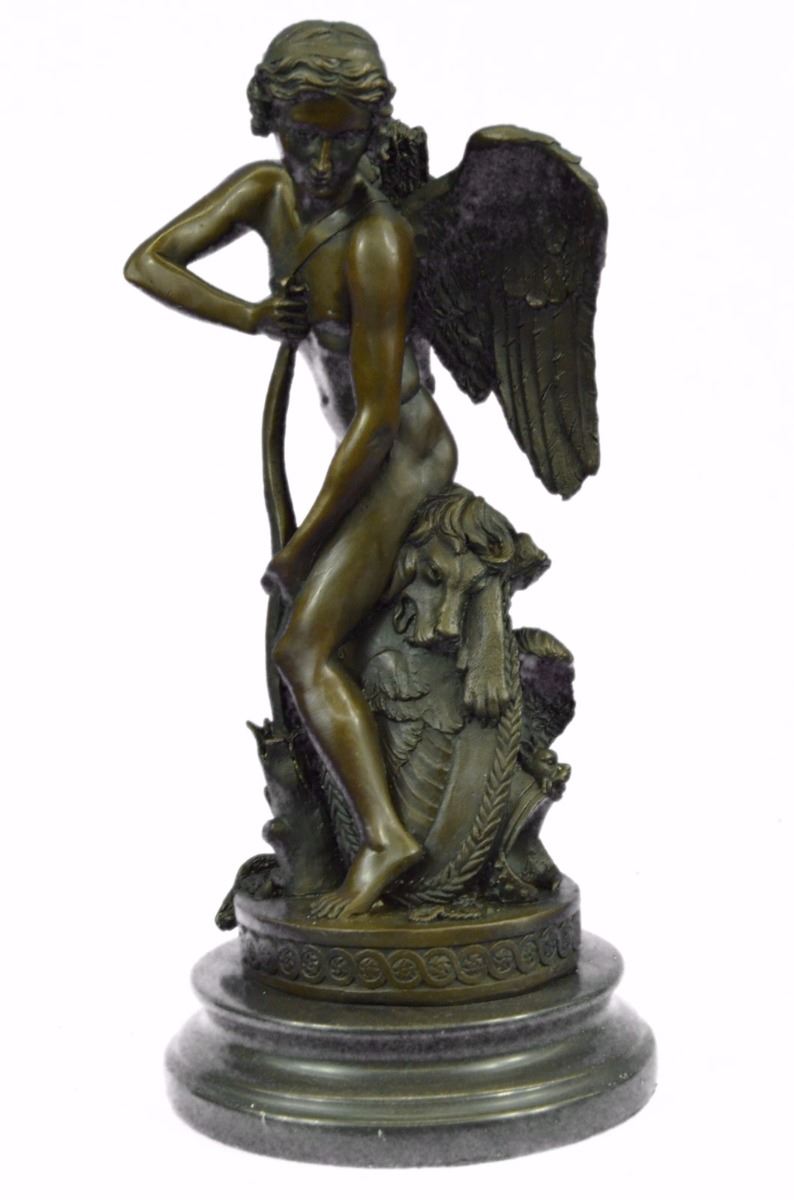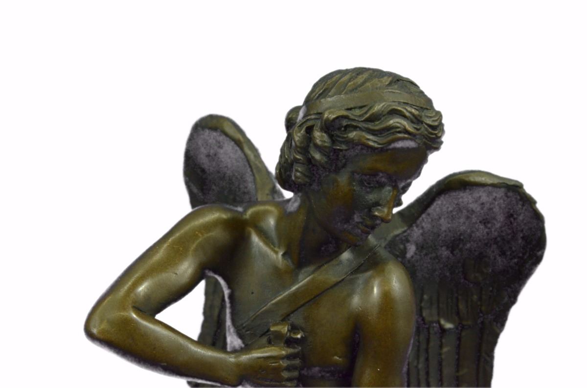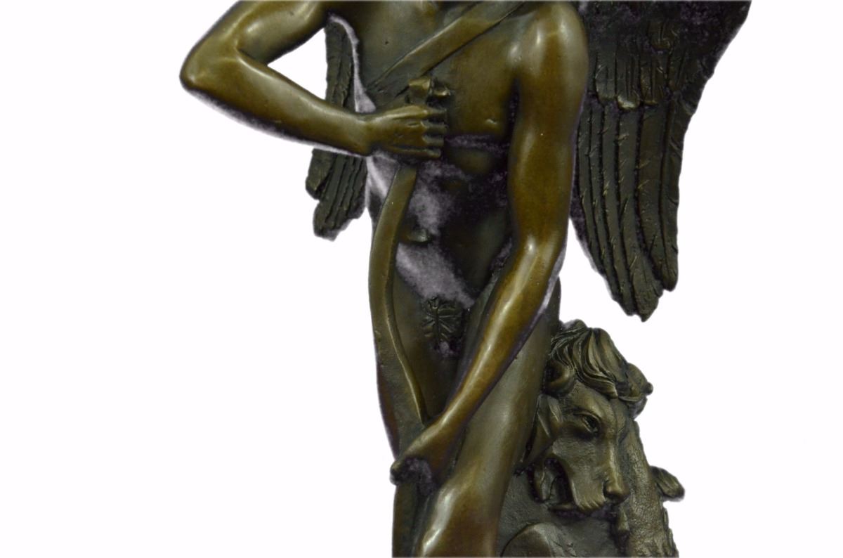 This Is A Bronze Sculpture Of Ipos, One Of The Many Fallen Angels, Who Appears As An Angel With A Lion's Head. With A Bundle Of Arrows Strapped To His Back, He Fixes His Bow, Sitting Against His Lion's Head Mask And Shield, Preparing To Rebel. The Handmade Bronze Sculpture Was Cast Using The Age-Old Method Of Lost-Wax Casting And Stained With A Brown Patina Finish For Preservation. It Is Mounted Upon A Variegated Black Marble Base With The Artist A. Bronze Dimensions With Marble Base: Height 13 X Width 7 inches. Weight: 12 Lbs.