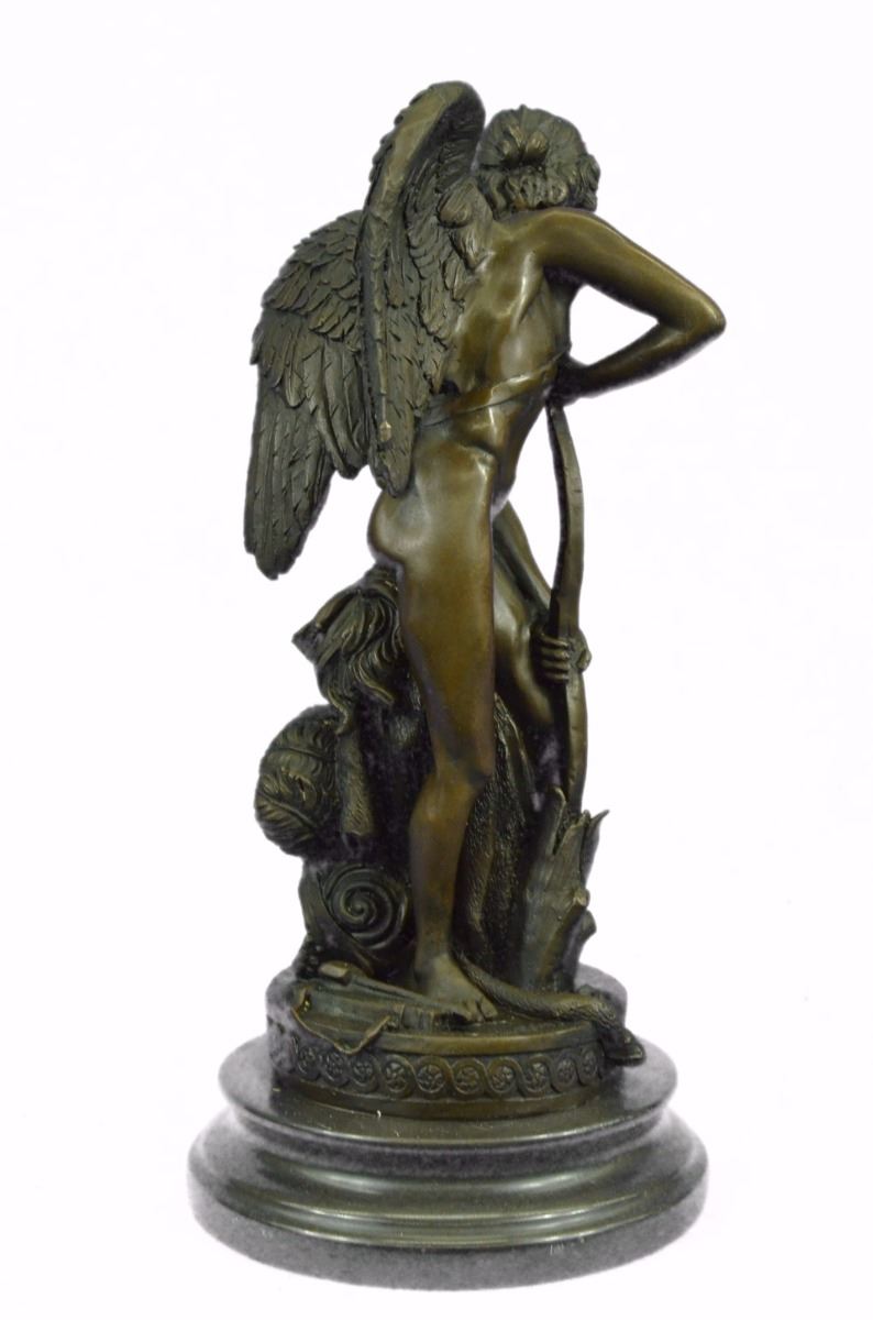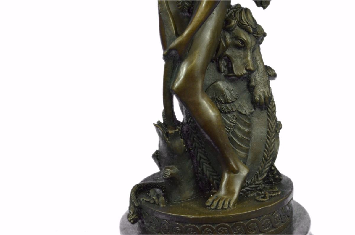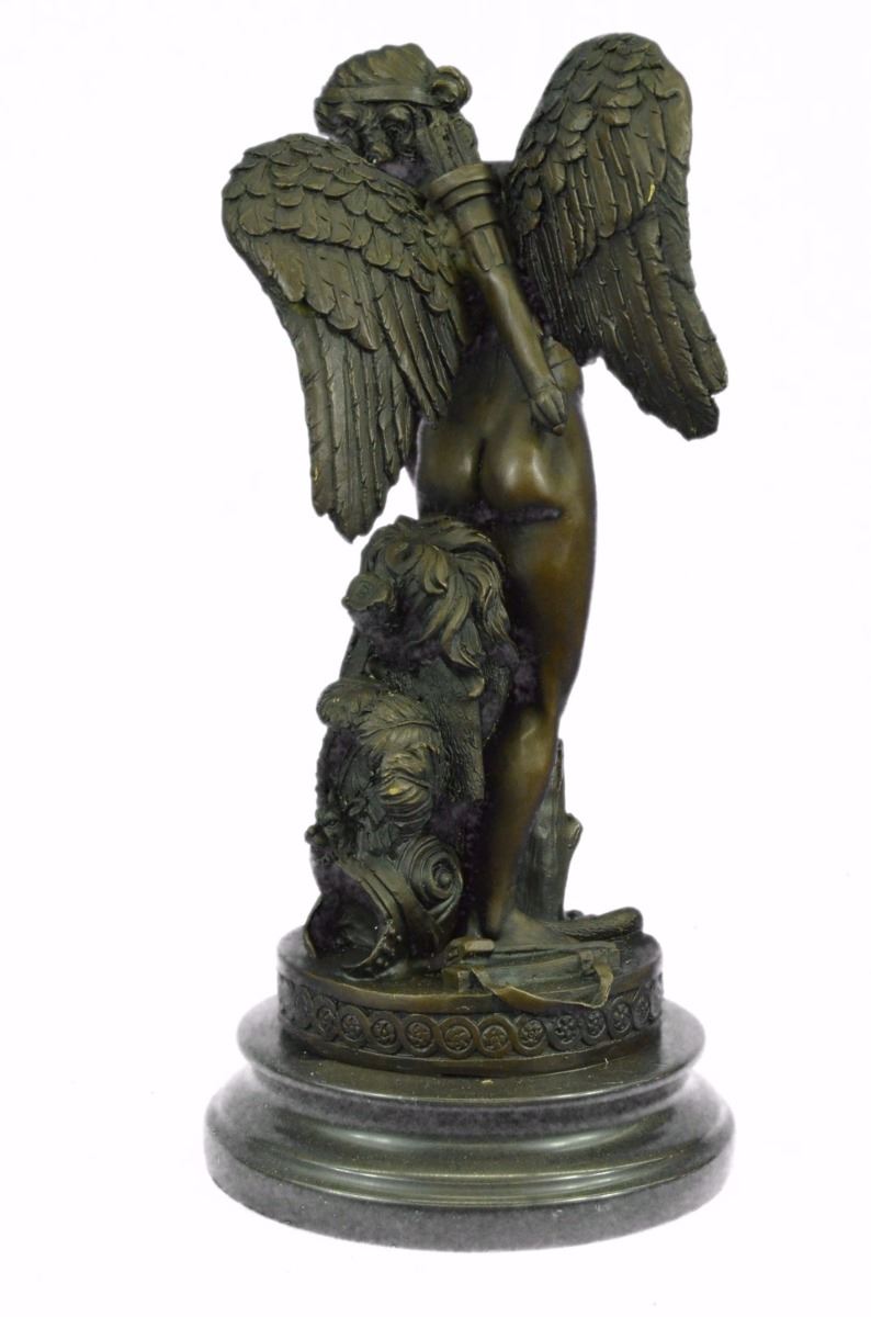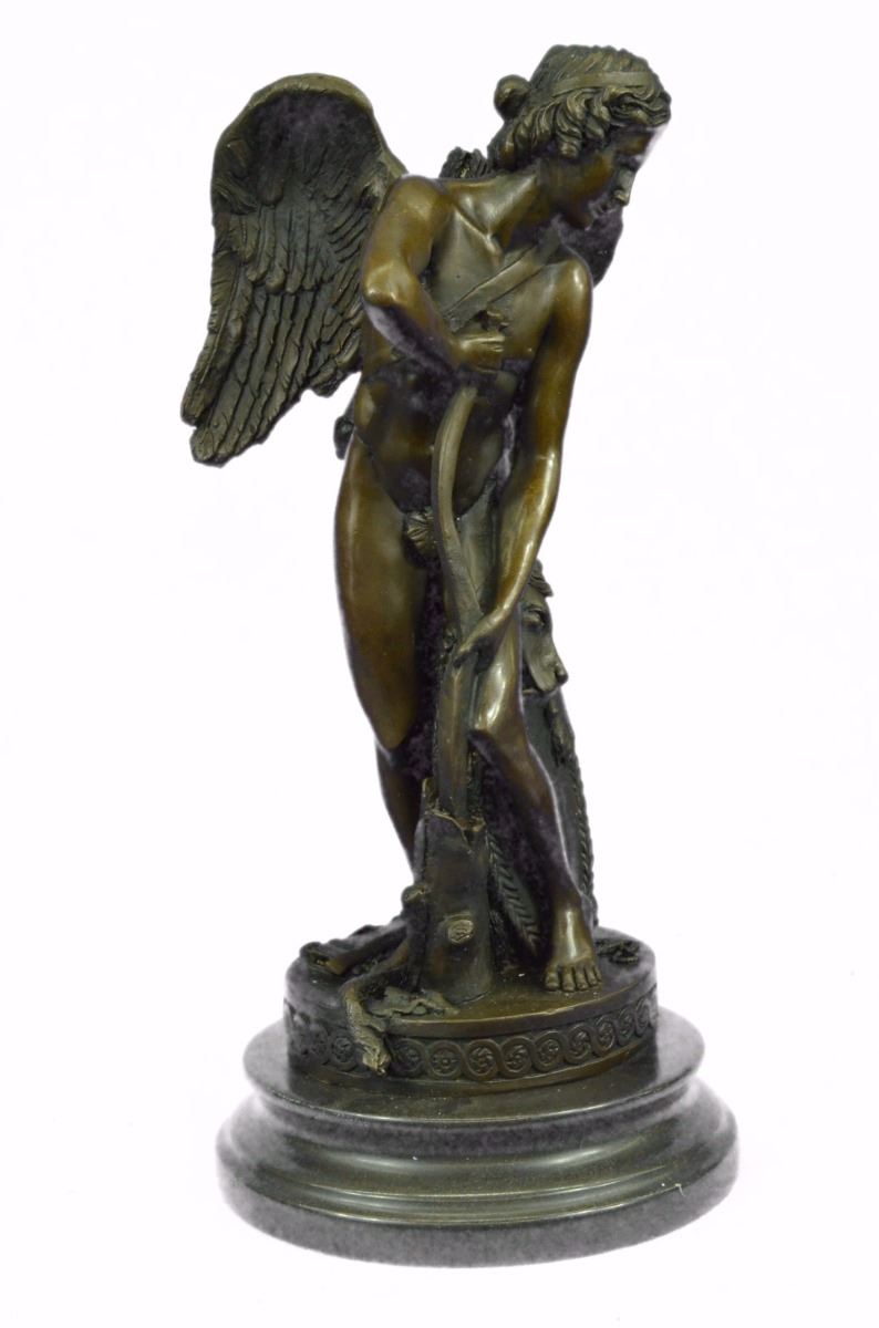 This Is A Bronze Sculpture Of Ipos, One Of The Many Fallen Angels, Who Appears As An Angel With A Lion's Head. With A Bundle Of Arrows Strapped To His Back, He Fixes His Bow, Sitting Against His Lion's Head Mask And Shield, Preparing To Rebel. The Handmade Bronze Sculpture Was Cast Using The Age-Old Method Of Lost-Wax Casting And Stained With A Brown Patina Finish For Preservation. It Is Mounted Upon A Variegated Black Marble Base With The Artist A. Bronze Dimensions With Marble Base: Height 13 X Width 7 inches. Weight: 12 Lbs.