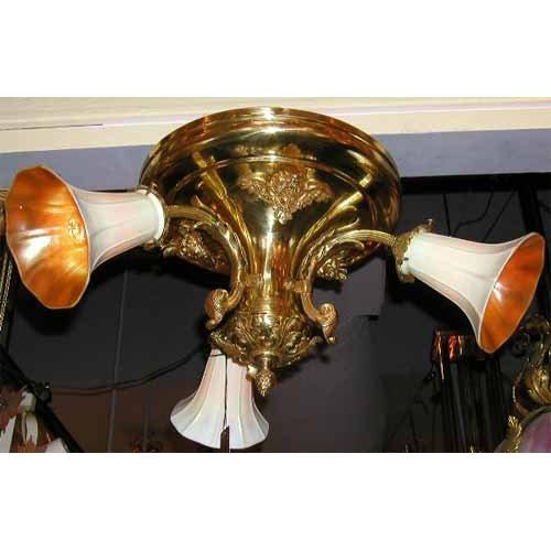Angel Chandelier. A flush mount chandelier with three winged angels. Included are three Quoizel signed shades with gold luster. An elegant addition.