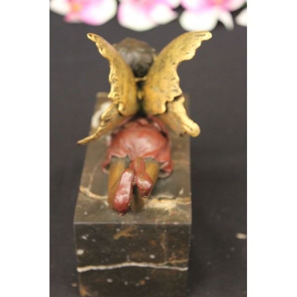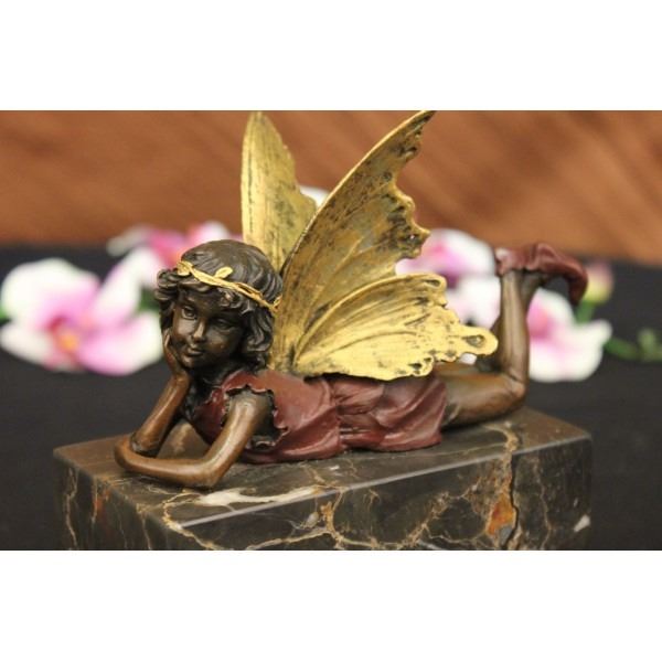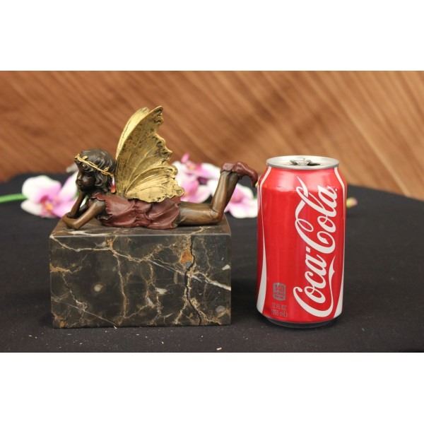Daydreamers will fall in love with this daydreaming fairy. She sits lazily in her mystical forest, her eyes taking in all the magic around her. She is lulled by the soft sounds of life and fantasy around her. With youthful innocence she giggles with glee and she talks to singing birds and fluttering butterflies. Her golden patina fairy wings arch behind her. She wears a red patina dress and matching shoes. This would make a sweet addition to any little girls room. This sculpture was cast using the Lost Wax Method and mounted on a marble base. Bronze Dimensions with Marble Base: Height 7 X Width 7 inches. Weight: 7 LBS.