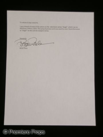 From the fantasy-drama television series 'Angel' (1999-2004) starring David Boreanaz and Charisma Carpenter. This is a screen used prop business card used by David Boreanaz' character 'Angel.' The card is a plain white business card with an outlined image of an Angel, along with a faux phone number. Comes with LOA. (measures approx. 2"x 3 1/2")