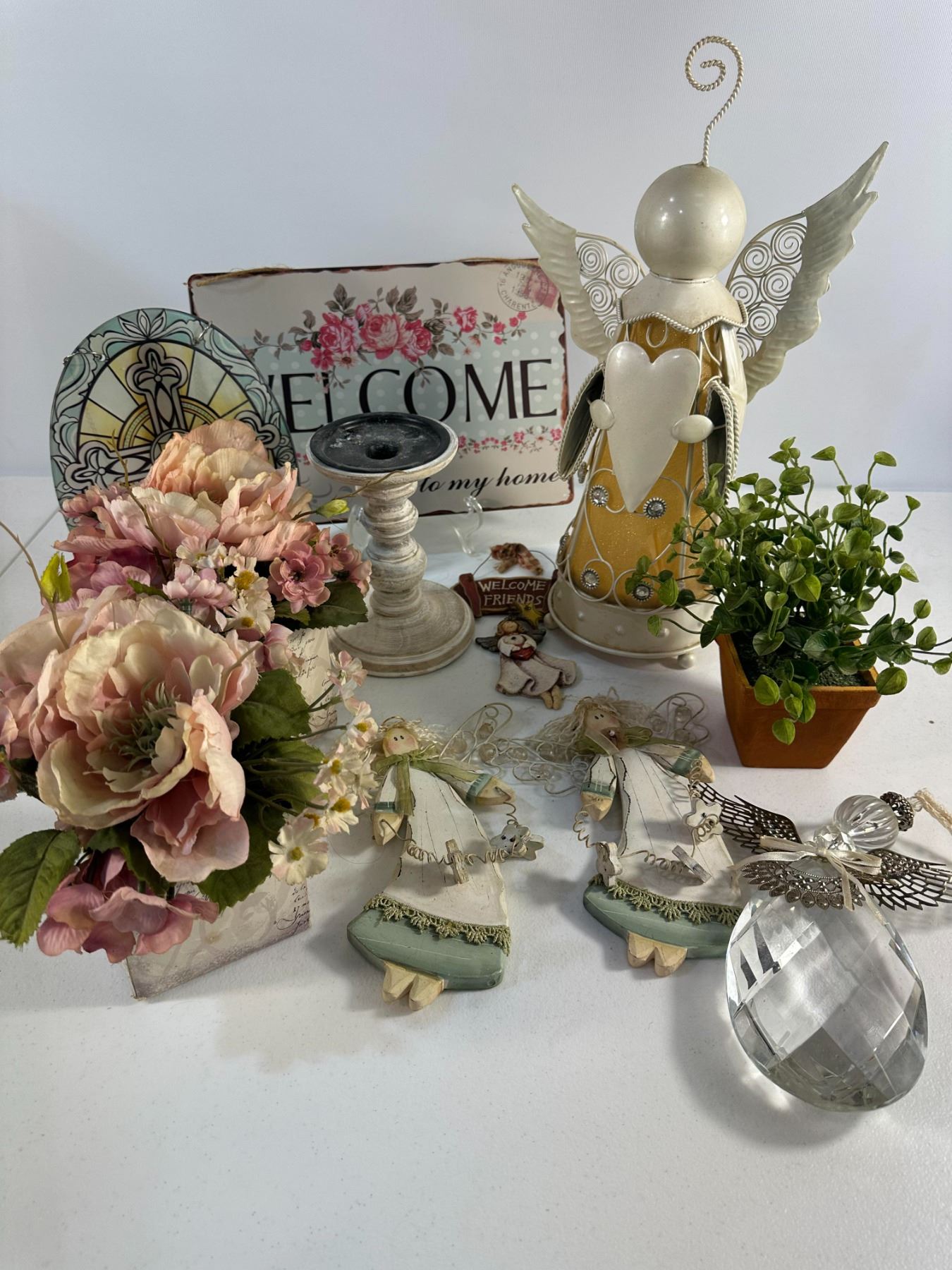 Decorative grouping featuring a wire and metal angel figurine, floral arrangement on a rustic wooden spool, and floral Welcome sign. Lovely cottage-style décor pieces in very good condition.
