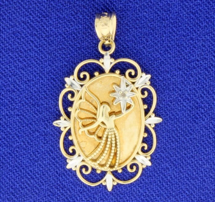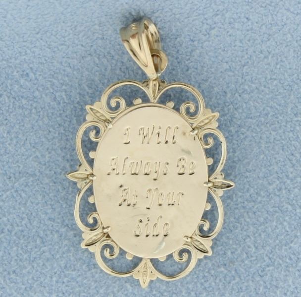 In 10K yellow & white gold, the angel pendant contains one 1/2pt diamond on front and has " I Will Always Be At Your Side" inscribed on back. It is 1 1/4 inches long. 1.4g