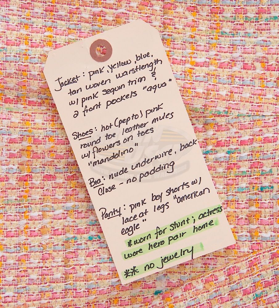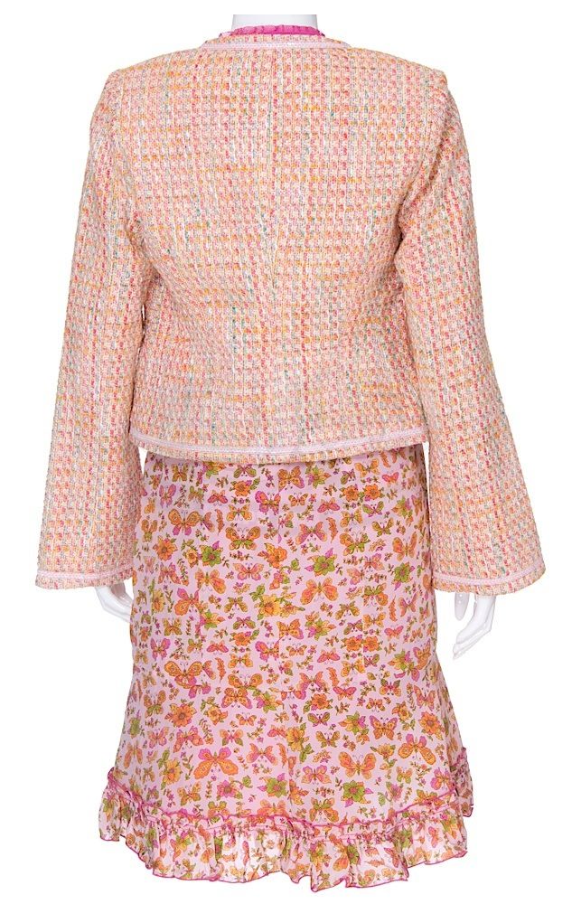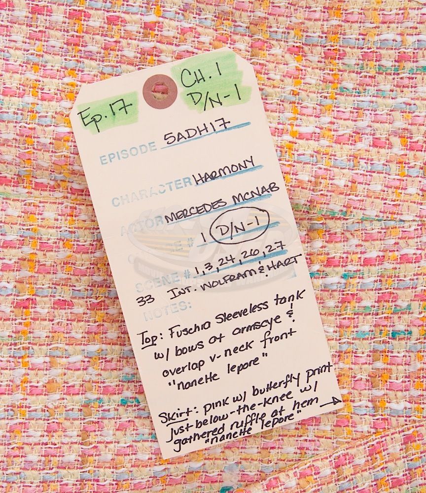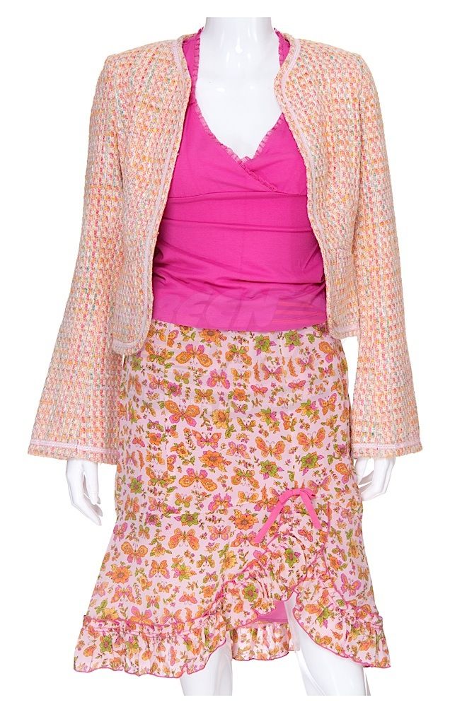 (WB-TV, 1999-2004) This outfit was acquired by the production for use by Mercedes McNab as "Harmony Kendall" during filming of season five of the series. The outfit consists of a jacket, sleeveless shirt and a skirt with butterfly print. Included with the outfit is a production used costume tag that details the entire outfit, change and scene number used. Along with our ScreenUsed COA, this outfit comes with a 20th Century Fox Archives COA confirming its use on screen.