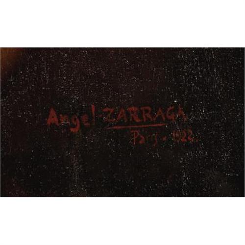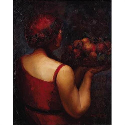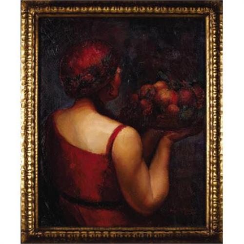 <B>ANGEL ZARRAGA </B></I>(Mexican 1886-1946)<BR><I>Basket of Plenty</B></I>, 1922<BR>Oil on canvas<BR>32 x 25 inches (81.3 x 63.5 cm)<BR>Signed lower right <I>Angel Zarraga, Paris 1922</B></I><BR> <BR>Provenance:<BR>Robert Ratner, New York;<BR>Felix Fenelon, France <BR><BR>Exhibition:<BR>Galerie Bernheim-Jeune, Paris <BR><BR>The model for the woman in this painting is most likely Angel Zarraga's first wife, Russian sportswoman Jeanette Ivanoff, whom he married in 1919. Ivanoff was a professional footballer and served as captain of the women's team during its first-place title year in 1922. She served as a model for her husband throughout his career, whether he was interpreting her face and figure in a cubist vocabulary or depicting her during his later and more romantic neo-classical phase. During this period, his work is somewhat uniform in composition and color: it is characterized by a warm, ruddy palette and very sculptural, solid forms. While Zarraga shows Jeanette Ivanoff clothed in the present work, he focuses on her muscular body, selectively revealing her sturdy upper back and muscular right arm. Her skin glows with a marvelous radiance against the carefully chosen soft red hues of the dress, hat, and basket of fruit. Angel Zarraga was a close associate of Diego Rivera, both during their student years at the National School of Fine Arts in Mexico City, and later in Paris.<BR><BR><b>Shipping:</b> Requires 3rd Party Shipping (<a target="_blank" href="http://www.heritageauctions.com/common/shipping.php">view shipping information</a>)
