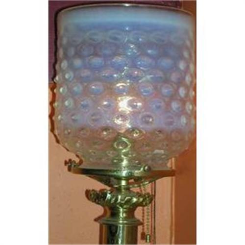 Angel and Gargoyle Oversized Table Lamp. A great oversized lamp with a unique design. The base has winged gargoyles and winged angels. Decorated center column. Hobnail opalescent shade. An elegant addition.