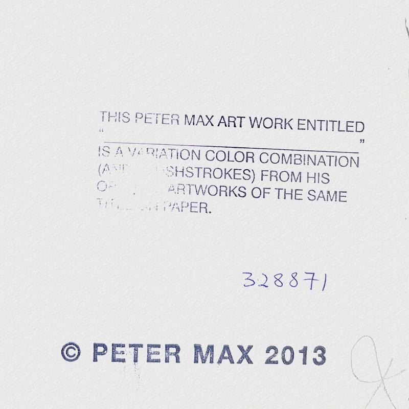 "Angel with Clouds" is a one-of-a-kind acrylic mixed media on paper, hand signed by Peter Max. The piece comes custom framed with a backside cutout to display Peter Max Studio registration number 328871 certifying authenticity. Measures approximately 24" x 22" (frame), 10" x 8" (image). This item requires special handling and may have a longer than usual turnaround.