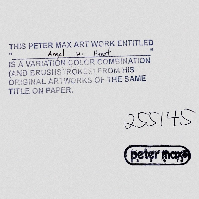 "Angel with Heart" is a one-of-a-kind mixed media on paper, hand signed by Peter Max. The piece comes custom framed with a backside cutout to display Peter Max Studio registration number 255145 certifying authenticity. Measures approximately 48" x 36" (frame), 36" x 24" (image).