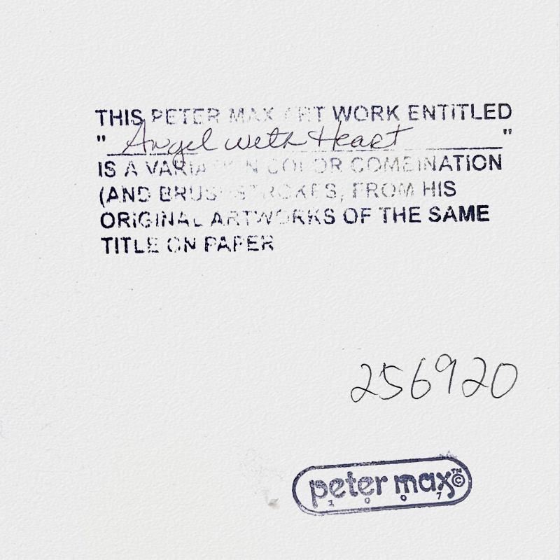 "Angel with Heart" is a hand signed one-of-a-kind acrylic mixed media on paper by Peter Max. The piece comes custom framed with a backside cutout to display Peter Max Studio registration number 256920 certifying authenticity. Measures approximately 30" x 26" (frame), 17" x 13" (image).