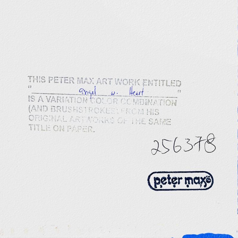 "Angel with Heart" is a hand signed one-of-a-kind acrylic mixed media on paper by Peter Max. The piece comes custom framed with a backside cutout to display Peter Max Studio registration number 256378 certifying authenticity. Measures approximately 30" x 26" (frame), 17" x 13" (image). This item requires special handling and may have a longer than usual turnaround.