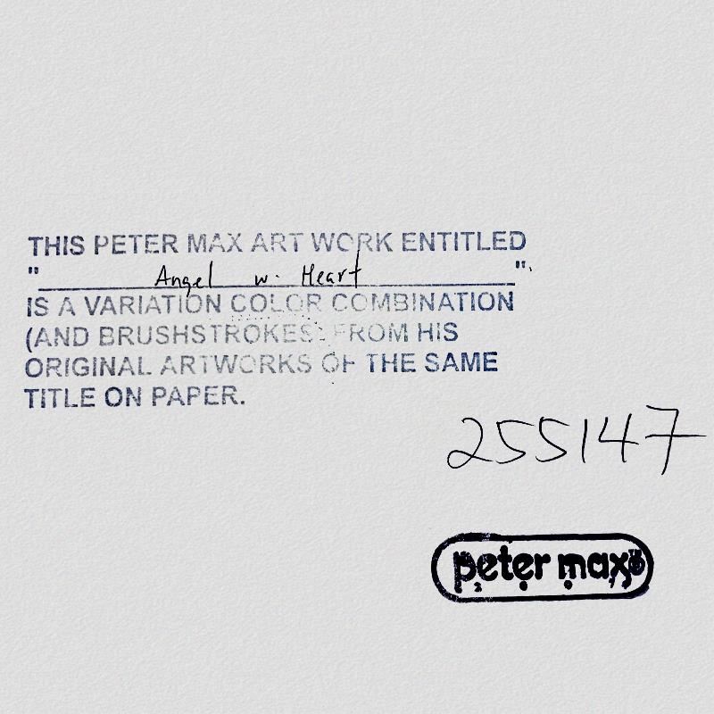 "Angel with Heart" is a one-of-a-kind mixed media on paper, hand signed by Peter Max. The piece comes custom framed with a backside cutout to display Peter Max Studio registration number 255147 certifying authenticity. Measures approximately 48" x 36" (frame), 36" x 24" (image). This item requires special handling and may have a longer than usual turnaround.