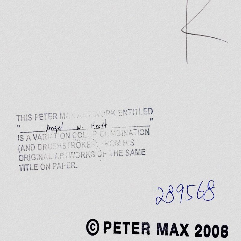 "Angel with Heart" is a one-of-a-kind mixed media on paper, hand signed by Peter Max. The piece comes custom framed with a backside cutout to display Peter Max Studio registration number 289568 certifying authenticity. Measures approximately 48" x 36" (frame), 36" x 24" (image). This item requires special handling and may have a longer than usual turnaround.