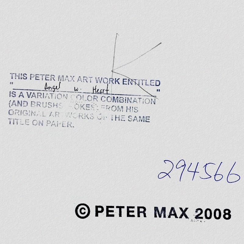 "Angel with Heart" is a one-of-a-kind mixed media on paper, hand signed by Peter Max. The piece comes custom framed with a backside cutout to display Peter Max Studio registration number 294566 certifying authenticity. Measures approximately 48" x 36" (frame), 36" x 24" (image). This item requires special handling and may have a longer than usual turnaround.