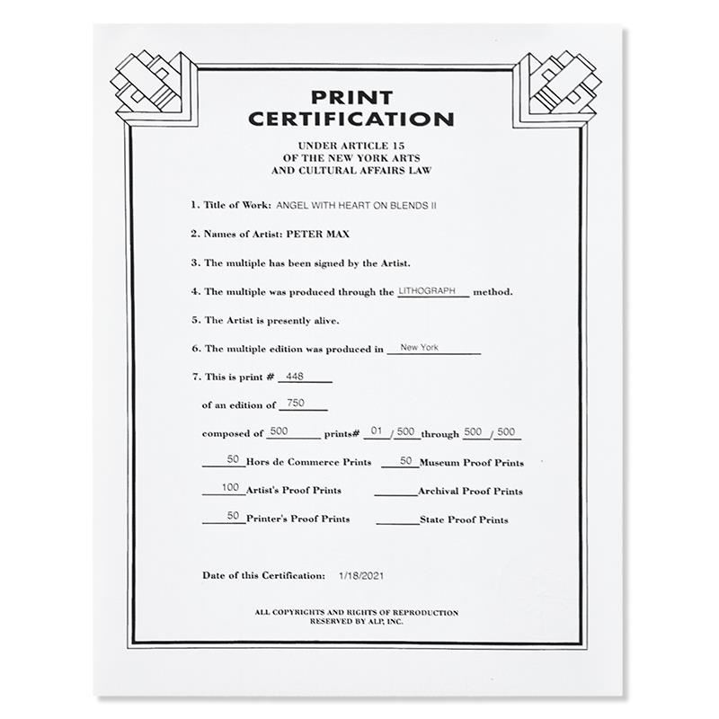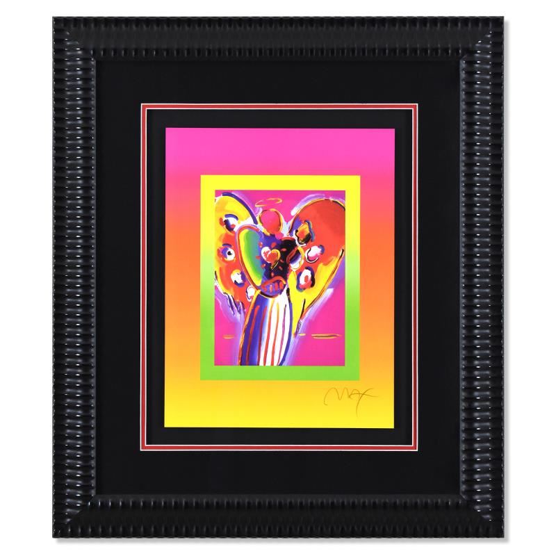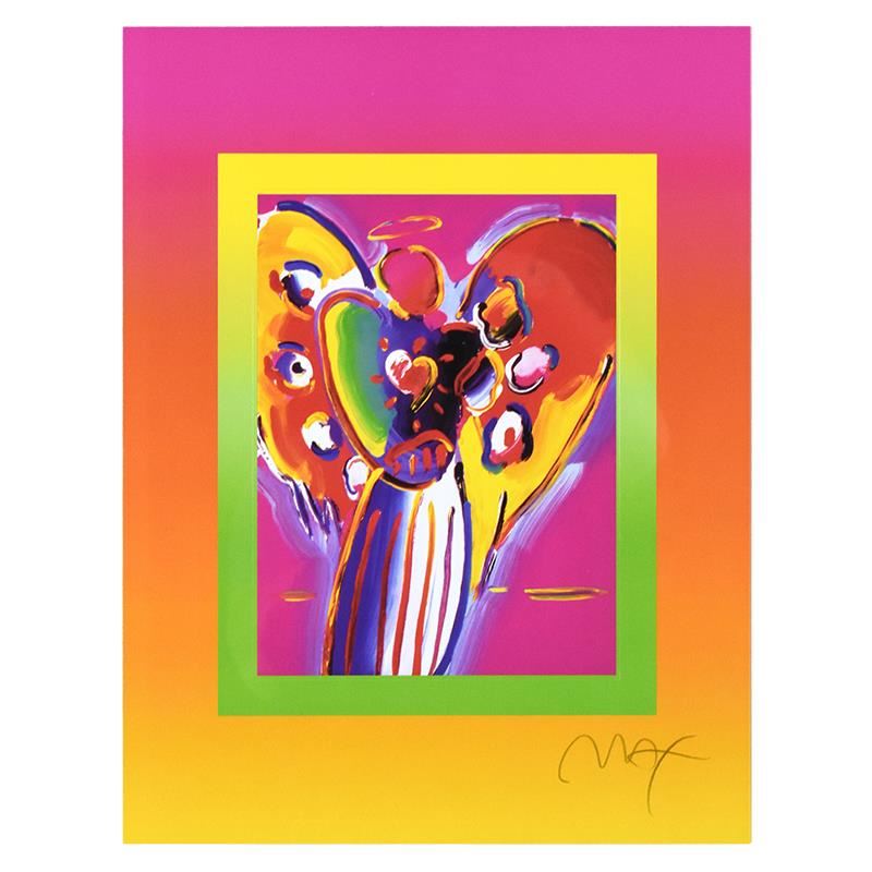 "Angel with Heart on Blends" is a limited edition lithograph on paper by Peter Max, numbered 448/500 and hand signed by the artist. This piece comes framed and includes Certificate of Authenticity from Peter Max Studios. Measures approximately 29.5" x 25.5 (frame), 17" x 13" (image).