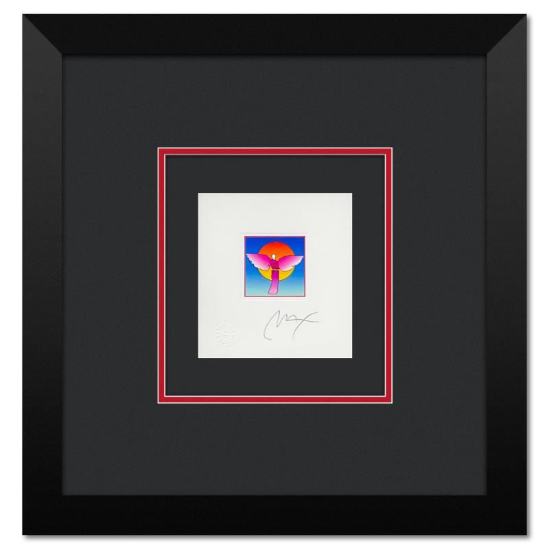 "Angel with Sun" is a limited edition lithograph on paper by Peter Max, numbered and hand signed by the artist. This piece comes framed. Includes Certificate of Authenticity from Peter Max Studios. Measures approx. 15" x 14.5" (frame), 5" x 4.5" (image).