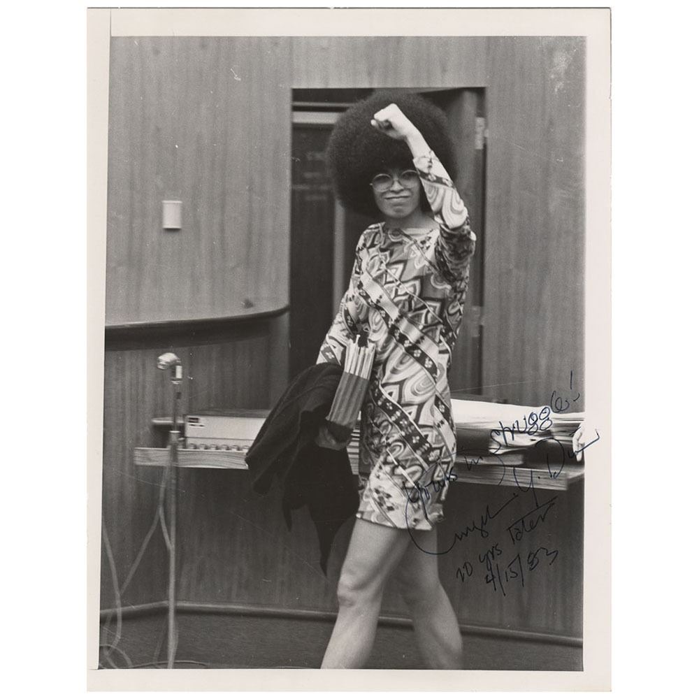 Glossy 7 x 9 photo of Davis with her fist powerfully raised, signed in black felt tip, "Yours in struggle! Angela Y. Davis, 20 yrs later, 4/15/83." In fine condition, with two light paperclip impressions.