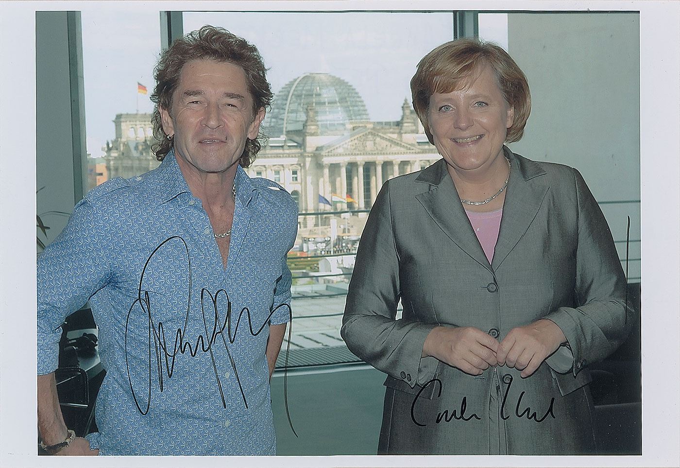 Color glossy 11.5 x 8 photo of German Chancellor Angela Merkel in her office with rock musician Peter Maffay, signed in black felt tip by both. In fine condition, with surface impressions from notations on the reverse.