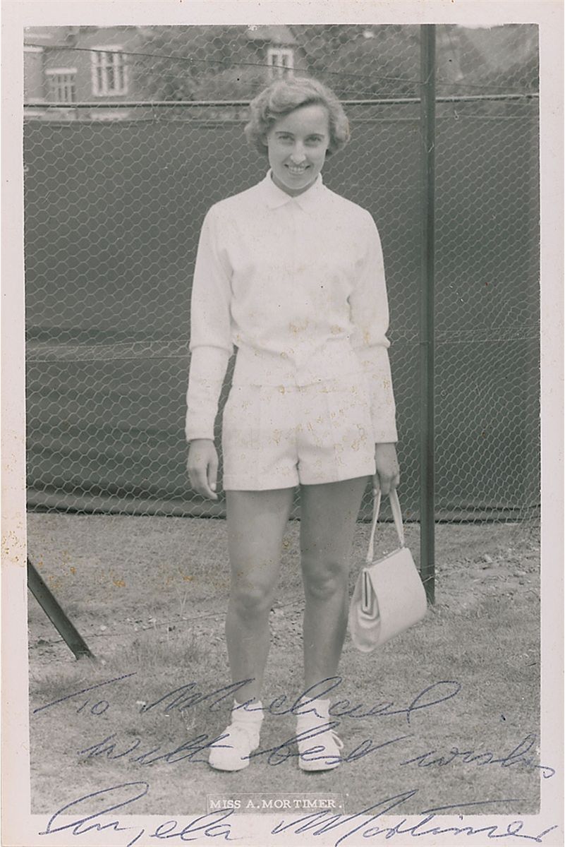 British tennis player who won three Grand Slam singles titles. Glossy 3.5 x 5.25 photo of Mortimer carrying a purse, signed and inscribed in black ballpoint, “To Michael, with best wishes, Angela Mortimer.” In fine condition, with some scattered spots of