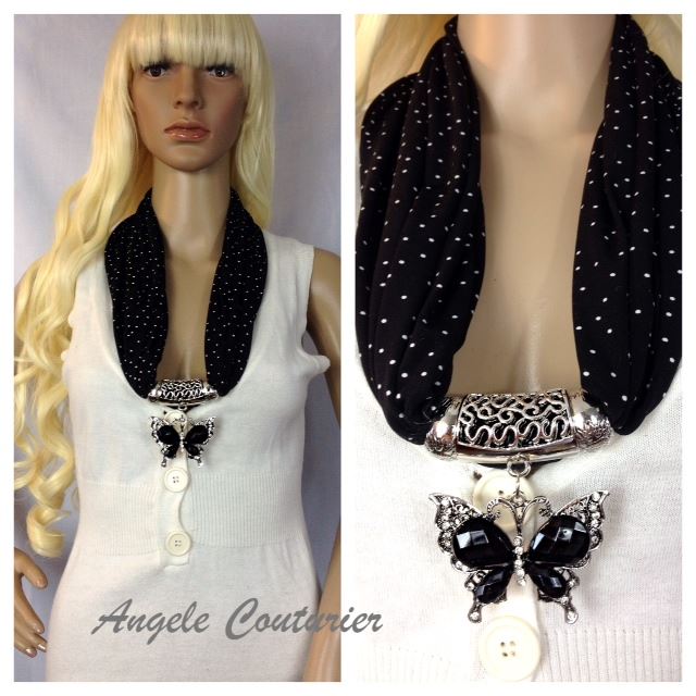 Black polkadot fashion scarf with gemmed butterfly pendant and scarf bails, unique creation in the Angele Couturier Scarf Collection; OS.
