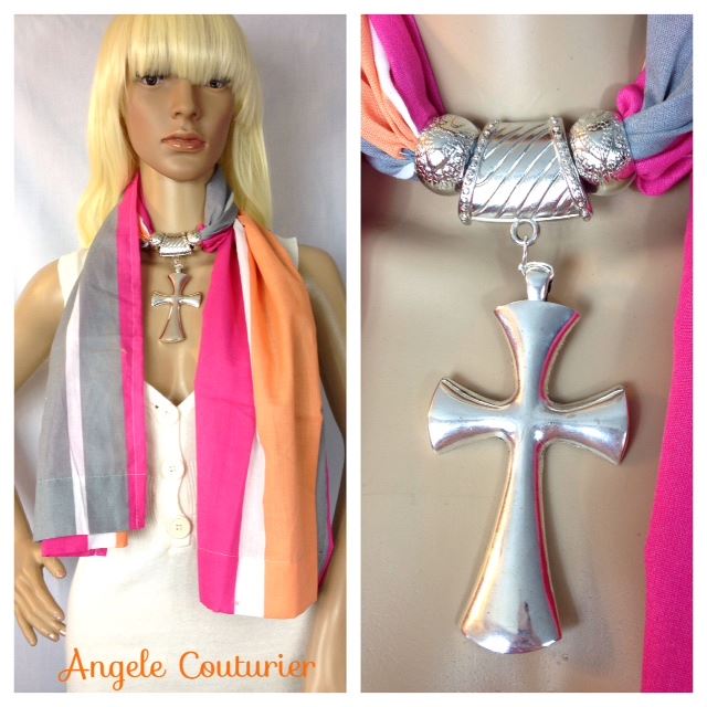 Unique creation in the Angele Couturier Scarf Collection: Fun coloured scarf with large lightweight cross pendant and bails; OS.
