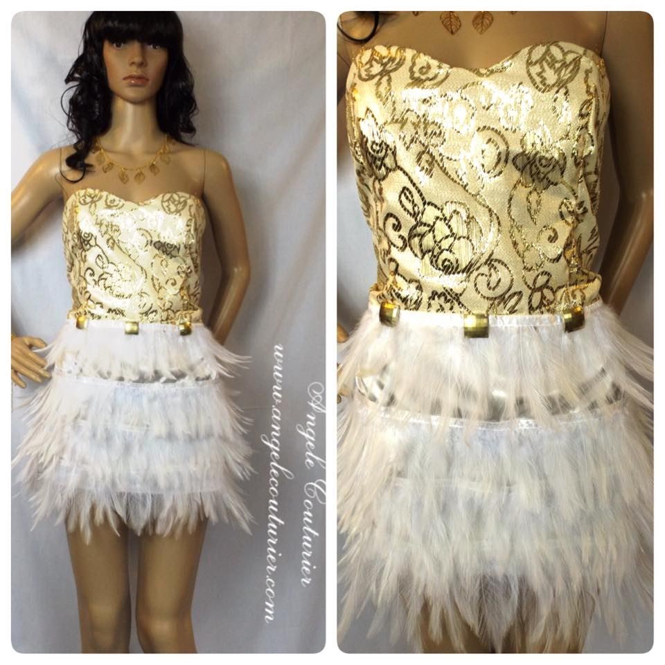 For you, an Angele Couturier unique and fun creation : Gold and white feathered dress; Satin lining; necklace not included; Size Medium-Large.