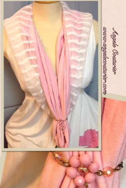 Foulard: Baby pink and white lace 2fer scarf with pink beaded scarf tie at base ; scarf by Angele Couturier, unique creation;