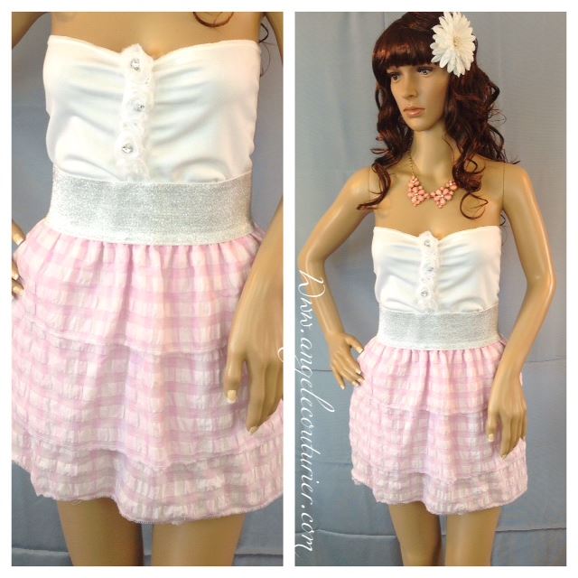 Gorgeous beautifully Sweet ruffled and plaid pink and white Summer sundress; Chiffon roses with gem accents; Will fit size small to medium; this collectible Angele Couturier unique creation is for you to use, to collect or give now !