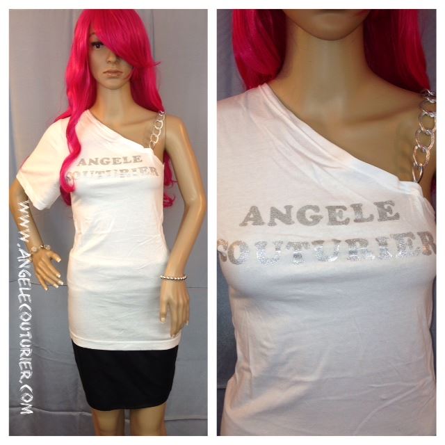 Angele Couturier Logo T-shirt: One flutter sleeve and one silver chain sleeve; Chain is very lightweight and sizable; Size small to medium.