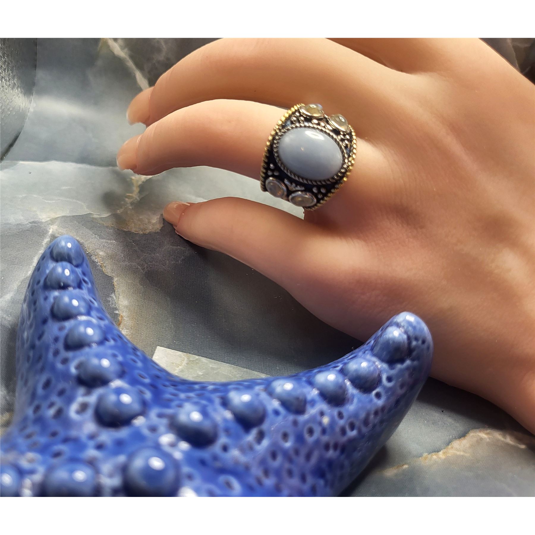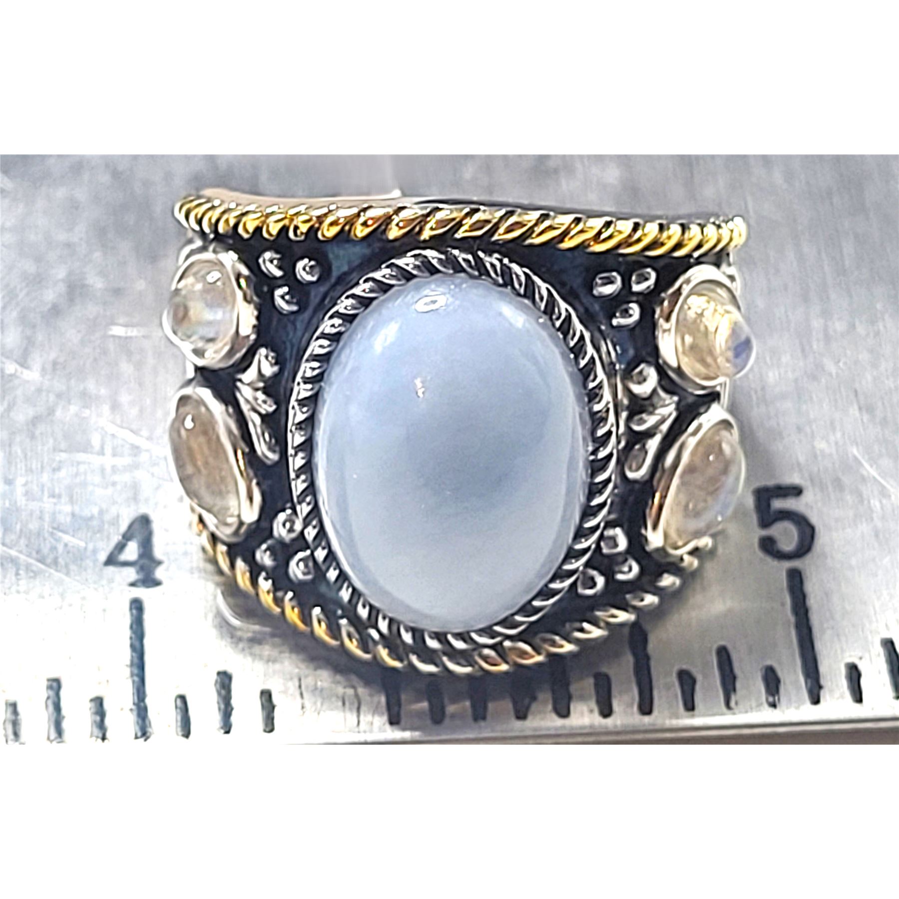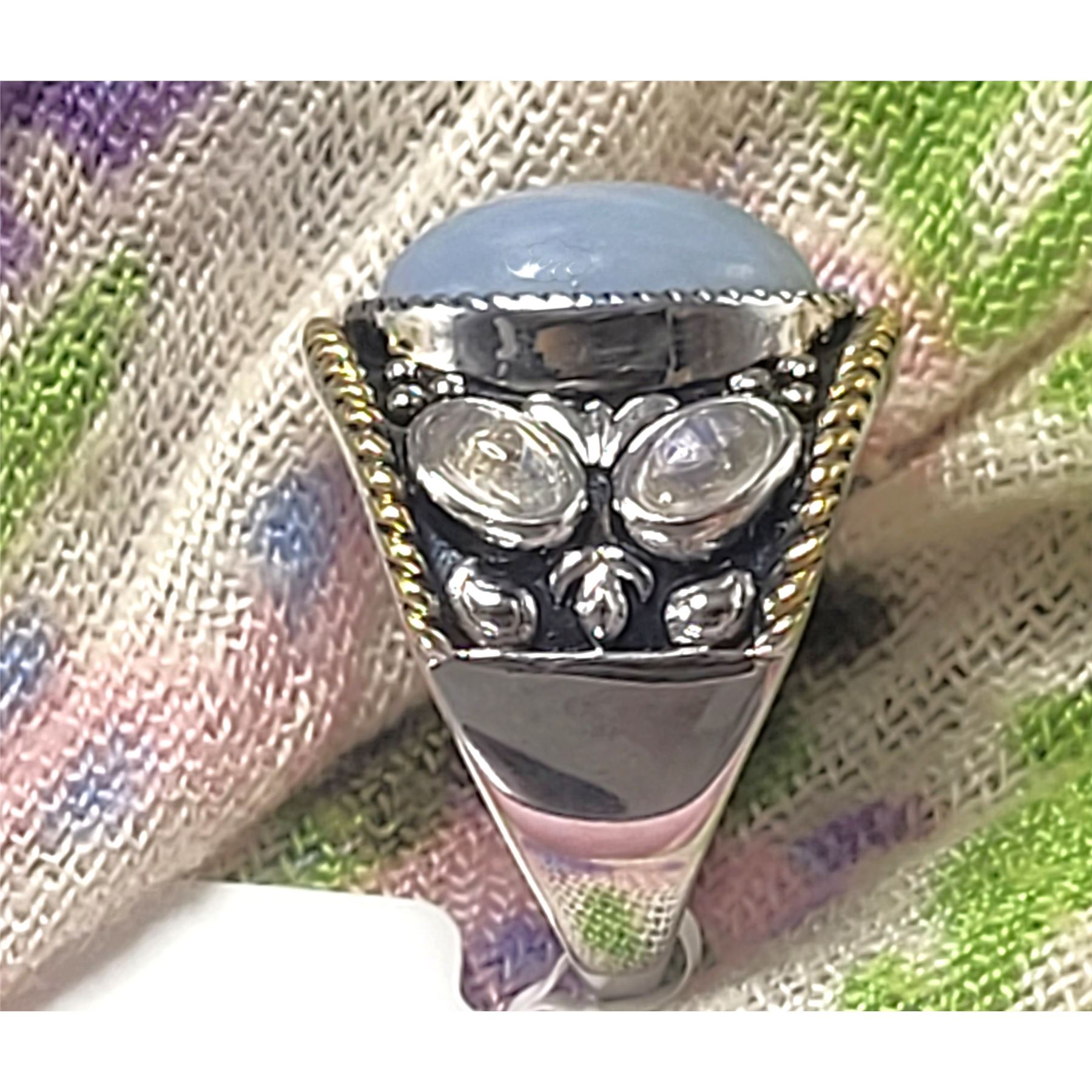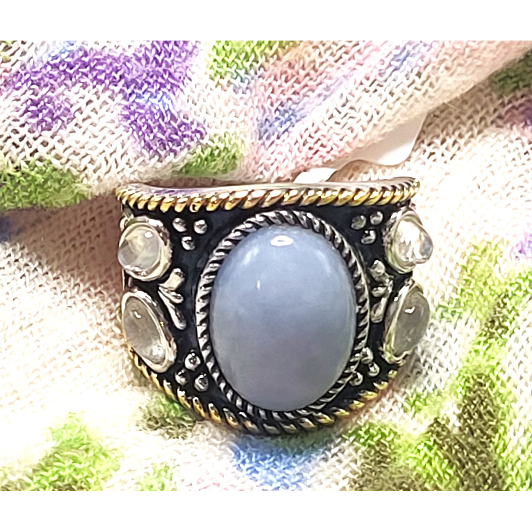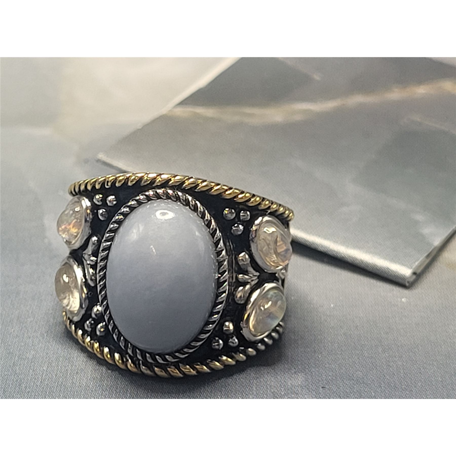 This striking sterling silver ring presents an intriquing gemstone called "angelite", alongside 1.03 carats total weight of rainbow moonstone. The 4.02 carat cabochon Angelite is bezel-set, centered on a wide top with . A rich black enamel has been applied to the wide shoulders that have butterfly designs, using the rainbow moonstones. The top of the ring is 19mm, tapering to an approximate 3.75mm. A beaded frame is accented in 14 karat yellow gold, accentuating the contrast between the black enamel and the soft lilac-blue angelite. This ring is US size 7. See below for other important information and details. 9.39 grams. AdminCode: 6282/29-gr