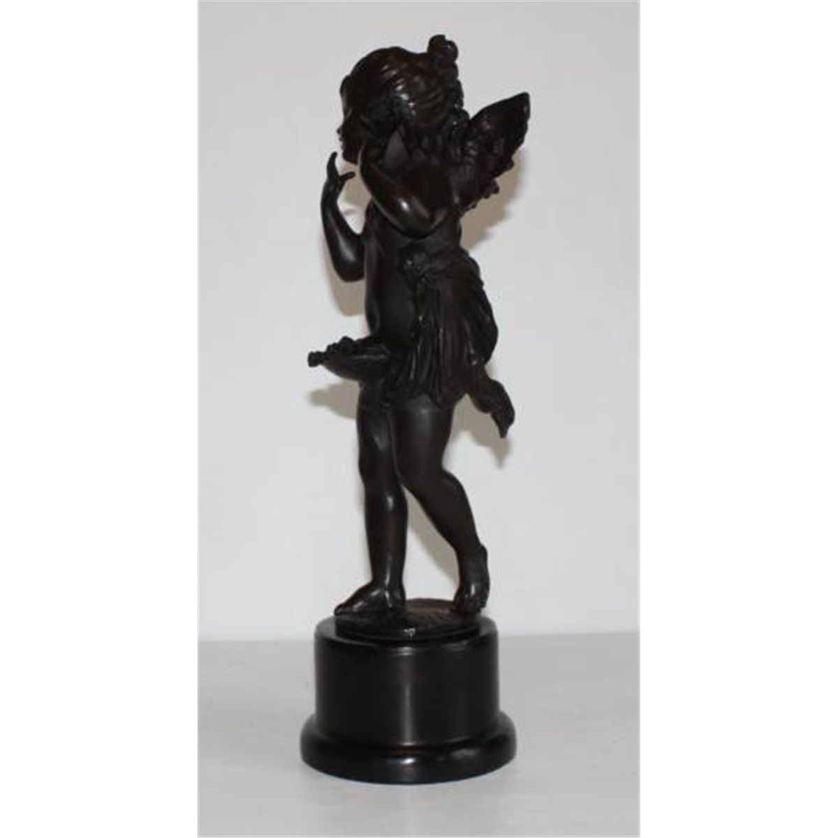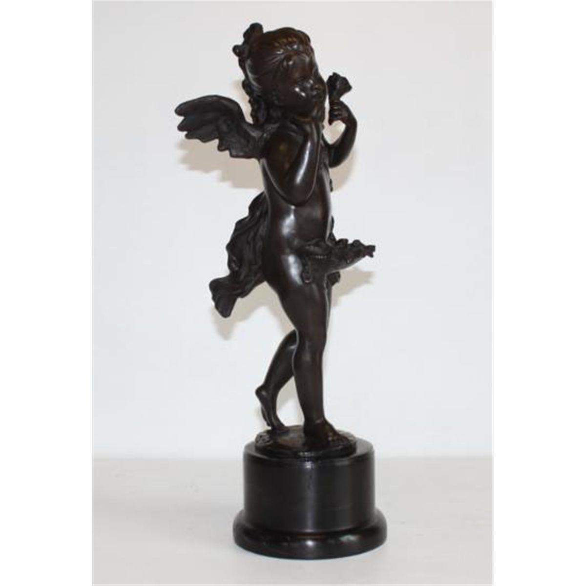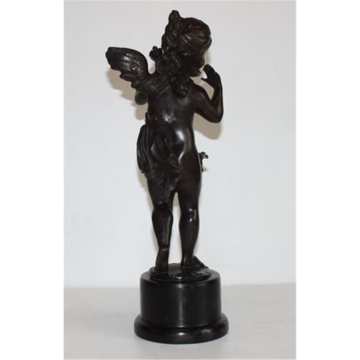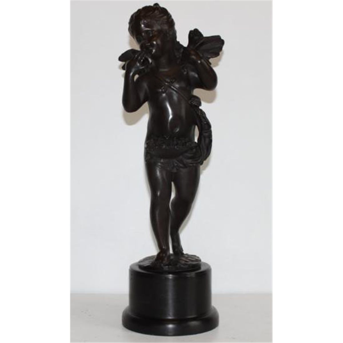 Cupid Bronze Sculpture, After Chiparus, 17"H x 6"H x 6"D 16 lbs. This bronze sculpture was produced using the "Lost Wax" casting method. The"Lost Wax" Cast method is the most precise metal casting technique in existence, ensuring exquisite detail of the original host model which is usually sculpted in clay or wax. This "Lost Wax" casting method is an extremely labor intensive and expensive process, but the end results produce a Heirloom Quality Masterpiece! In Roman mythology, Cupid (Latin cupido) is the god of erotic love and beauty. He is also known by another one of his Latin names, Amor (cognate with Kama). He is the son of goddess Venus.In popular culture Cupid is frequently shown shooting his bow to inspire romantic love, often as an icon of Valentine's Day.The most common holiday representation of Cupid is a putto with wings, wearing a diaper, holding a bow and arrow. Sometimes the arrow will have a heart for its tip.Modern reinterpretations of the Cupid character may leave off traditional details of the character, but the character's main purpose generally remains to help or make people fall in love or possibly engage in physical intimacy.Demetre Chiparus - The first sculptures of Chiparus were created in the realistic style and were exhibited at the Salon of 1914. He employed the combination of bronze and ivory, called chryselephantine, to great effect. Most of his renowned works were made between 1914 and 1933. The first series of sculptures manufactured by Chiparus were the series of the children.The mature style of Chiparus took shape beginning in the 1920s. His sculptures are remarkable for their bright and outstanding decorative effect. Dancers of the Russian Ballet, French theatre, and early motion pictures were among his more notable subjects and were typified by a long, slender, stylized appearance. His work was influenced by an interest in Egypt, after Pharaoh Tutankhamen's tomb was excavated.He worked primarily with the Edmond Etling and Cie Foundry in Paris administrated by Julien Dreyfus. Les Neveux de J. Lehmann was the second foundry who constantly worked with Chiparus and produced the sculptures of his models.Chiparus rarely exhibited at the Salon. In 1923 he showed his "Javelin Thrower" and in 1928 exhibited his "Ta-Keo" dancer. During the period of Nazi persecution and the World War 2 the foundries discontinued production of work by Chiparus. The economic situation of that time was not favorable to the development of decorative arts and circumstances for many sculptors worsened.Since the early 1940s almost no works of Chiparus were sold but the he continued sculpting for his own pleasure, depicting animals in the Art Deco style. At the 1942 Paris Salon, the plaster sculptures "Polar Bear" and "American Bison" were exhibited and in 1943 he showed a marble "Polar Bear" and plaster "Pelican".Collector interest in the work of Chiparus appeared in the 1970s and has flourished since the 1990s.