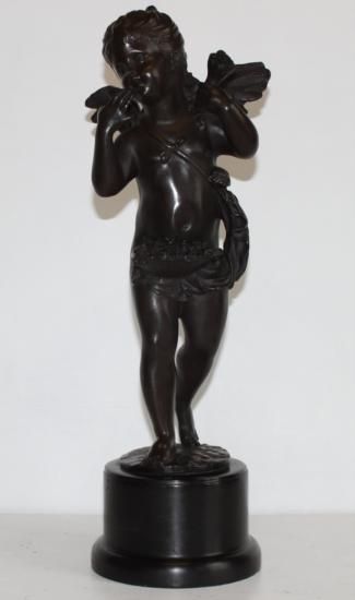 Cupid Bronze Sculpture, After Chiparus, 17"H x 6"H x 6"D 16 lbs. This bronze sculpture was produced using the "Lost Wax" casting method. The"Lost Wax" Cast method is the most precise metal casting technique in existence, ensuring exquisite detail of the original host model which is usually sculpted in clay or wax. This "Lost Wax" casting method is an extremely labor intensive and expensive process, but the end results produce a Heirloom Quality Masterpiece! In Roman mythology, Cupid (Latin cupido) is the god of erotic love and beauty. He is also known by another one of his Latin names, Amor (cognate with Kama). He is the son of goddess Venus.In popular culture Cupid is frequently shown shooting his bow to inspire romantic love, often as an icon of Valentine's Day.The most common holiday representation of Cupid is a putto with wings, wearing a diaper, holding a bow and arrow. Sometimes the arrow will have a heart for its tip.Modern reinterpretations of the Cupid character may leave off traditional details of the character, but the character's main purpose generally remains to help or make people fall in love or possibly engage in physical intimacy.Demetre Chiparus - The first sculptures of Chiparus were created in the realistic style and were exhibited at the Salon of 1914. He employed the combination of bronze and ivory, called chryselephantine, to great effect. Most of his renowned works were made between 1914 and 1933. The first series of sculptures manufactured by Chiparus were the series of the children.The mature style of Chiparus took shape beginning in the 1920s. His sculptures are remarkable for their bright and outstanding decorative effect. Dancers of the Russian Ballet, French theatre, and early motion pictures were among his more notable subjects and were typified by a long, slender, stylized appearance. His work was influenced by an interest in Egypt, after Pharaoh Tutankhamen's tomb was excavated.He worked primarily with the Edmond Etling and Cie Foundry in Paris administrated by Julien Dreyfus. Les Neveux de J. Lehmann was the second foundry who constantly worked with Chiparus and produced the sculptures of his models.Chiparus rarely exhibited at the Salon. In 1923 he showed his "Javelin Thrower" and in 1928 exhibited his "Ta-Keo" dancer. During the period of Nazi persecution and the World War 2 the foundries discontinued production of work by Chiparus. The economic situation of that time was not favorable to the development of decorative arts and circumstances for many sculptors worsened.Since the early 1940s almost no works of Chiparus were sold but the he continued sculpting for his own pleasure, depicting animals in the Art Deco style. At the 1942 Paris Salon, the plaster sculptures "Polar Bear" and "American Bison" were exhibited and in 1943 he showed a marble "Polar Bear" and plaster "Pelican".Collector interest in the work of Chiparus appeared in the 1970s and has flourished since the 1990s.