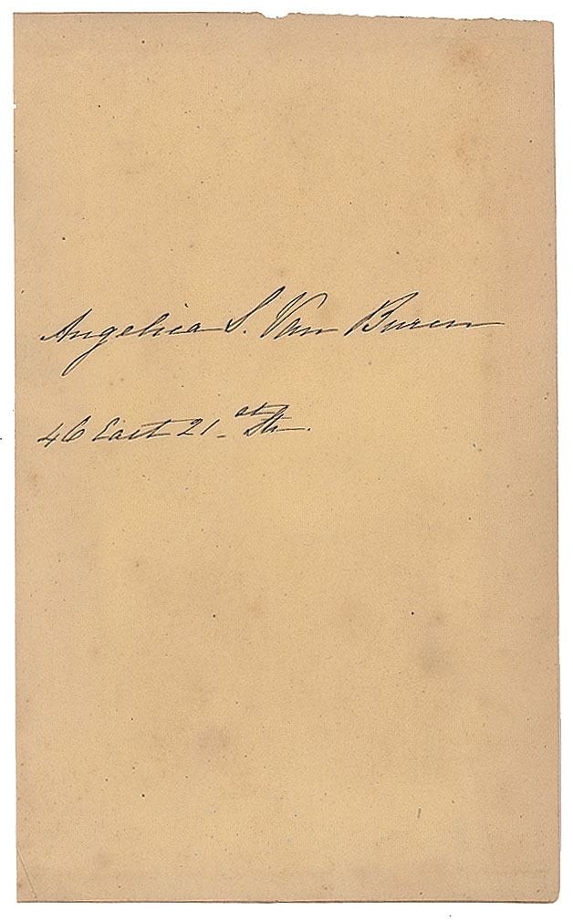 Ink signature, "Angelica S. Van Buren, 46 East 21st Str.,” on an off-white 4.5 x 7.25 sheet. In fine condition, with light toning and soiling.