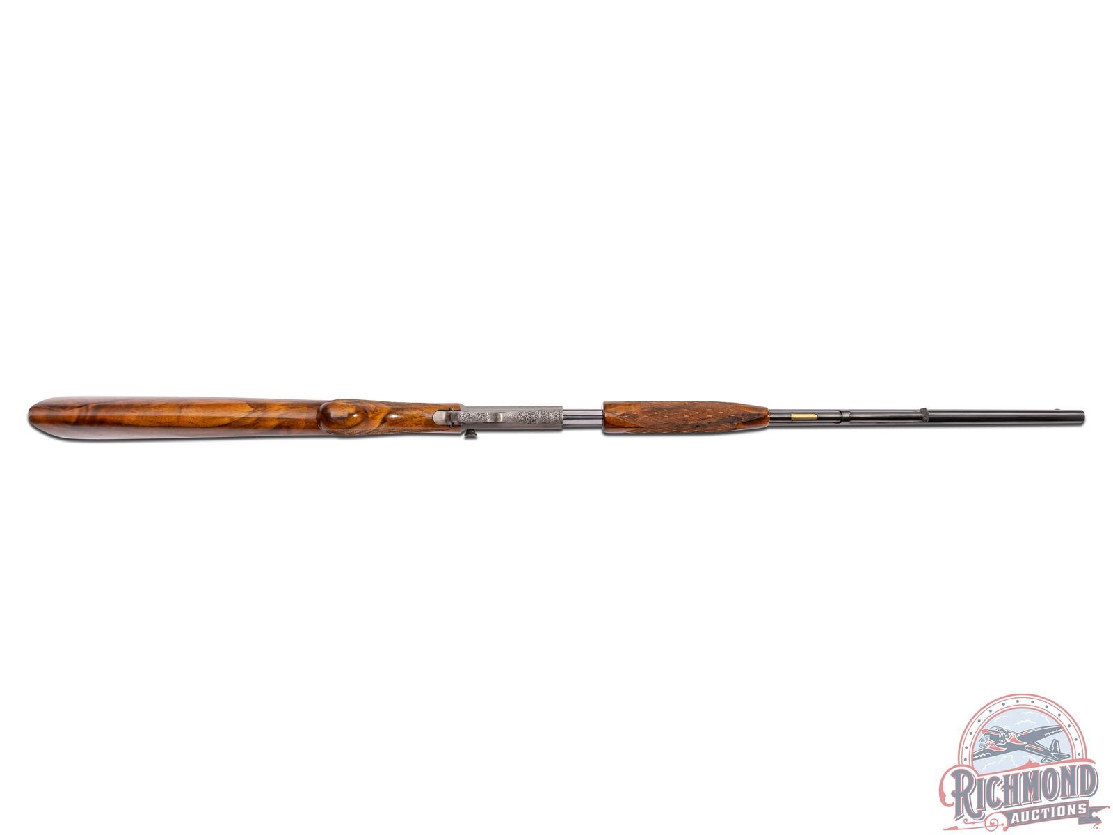 Made in Herstal, Belgium by Browning in 1926 for export and upgraded (possibly at a custom shop) at an unknown time by Master Gunsmith Angelo Bee. Rifle to be pictured in up and coming Angelo Bee Engraving Book. 22" blued round fluid steel barrel in 22 Long caliber with "Browning Patent Depose" export address at F.N. with bead pedestal front sight and stamped steel rear sight. Barrel is marked at breech with Belgium proofs. Satin finished takedown frame with blued tubular magazine. Action has full coverage floral engraving done in a style similar to Grade III with setter flushing ducks on right, dog with bird scene on top, and setter flushing pheasants on left. Action has gold washed trigger with blued push button safety and slide release. Dogs and bird are done in gold with right side scene signed in corner "A.Bee". Light tone figured walnut stock with round knob pistol grip and skip-line checkered tapered forend. Possibly done as an upgrade by Angelo Bee or in the custom shop when he worked for Browning. An extremely rare and beautiful example of gunmaking. LOP: 13-1/2". DAC: 1-3/4". DAH: 2-3/4". CALIBER: 22L. S/N: 17337. FFL STATUS: Curio & Relic.