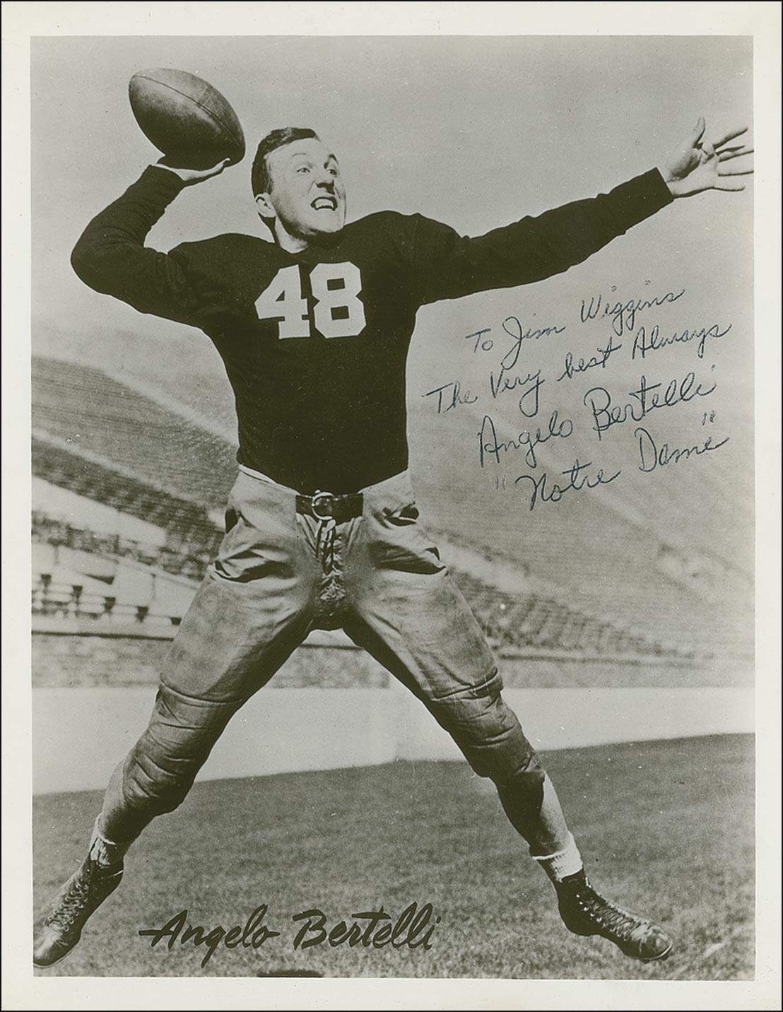 College Football Hall of Famer (1921–1999) who played quarterback for Notre Dame and won the Heisman trophy in 1943. Glossy 8 x 10 photo of Bertelli throwing a pass in his Notre Dame uniform, signed and inscribed in black ballpoint “To Jim Wiggins, The very best always, Angelo Bertelli ‘Notre Dame.’” In fine condition, with a few light creases and surface marks, and a bit of light skipping to signature and inscription.