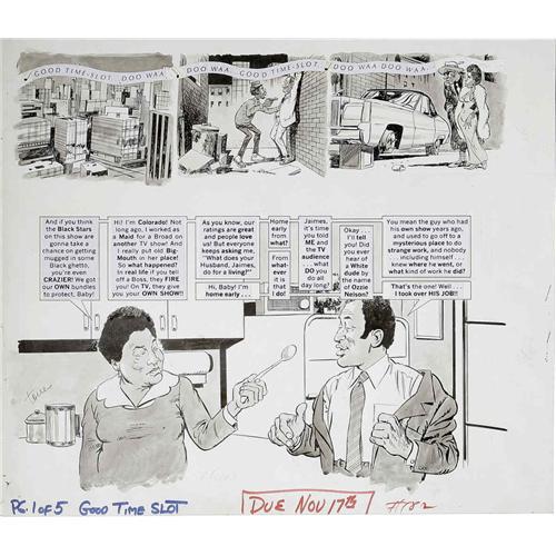 <B>Angelo Torres - Mad #182 Complete 5-page Story "Good Time-Slot" Original Art (EC, 1976).</B></I> This Angelo Torres parody of "Good Times" is <I>dyno-mite!</B></I> Who knew that living in the Chicago projects could be so much fun? The first page of this story has an image area of 16" x 15", and the rest of the pages have an image area of 16" x 22". All of the art is in Excellent condition. <I>From the Mad Magazine Archives</B></I>.
