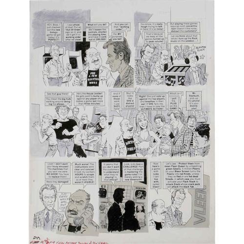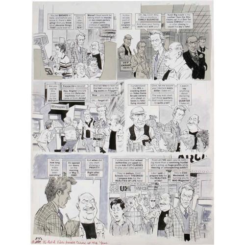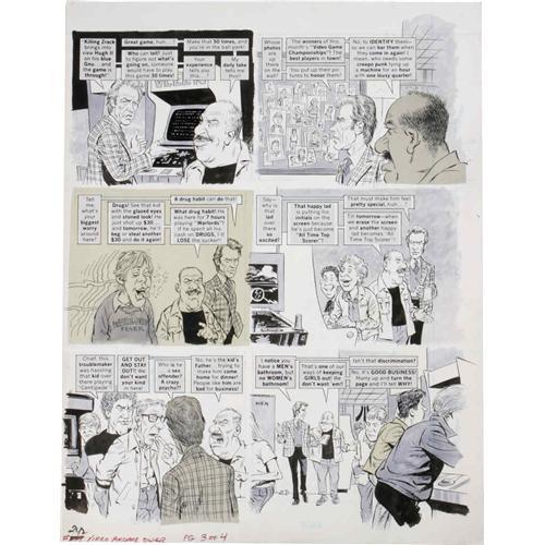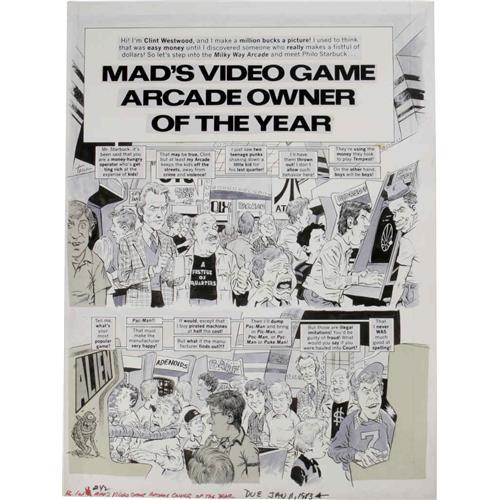 <B>Angelo Torres - Mad #242 Complete 4-page Story "Mad's Video Game Arcade Owner of the Year" Original Art (EC, 1983).</B></I> "Clint Westwood" explores the ins and outs of the Video Arcade biz in this piece of eighties investigative journalism -- <B>Mad</B></I> style. Angelo Torres' caricatures of Clint Eastwood are first-rate. Each page of the story has an image area of 17" x 22" and the art is in Excellent condition. <I>From the Mad Magazine Archives</B></I>.